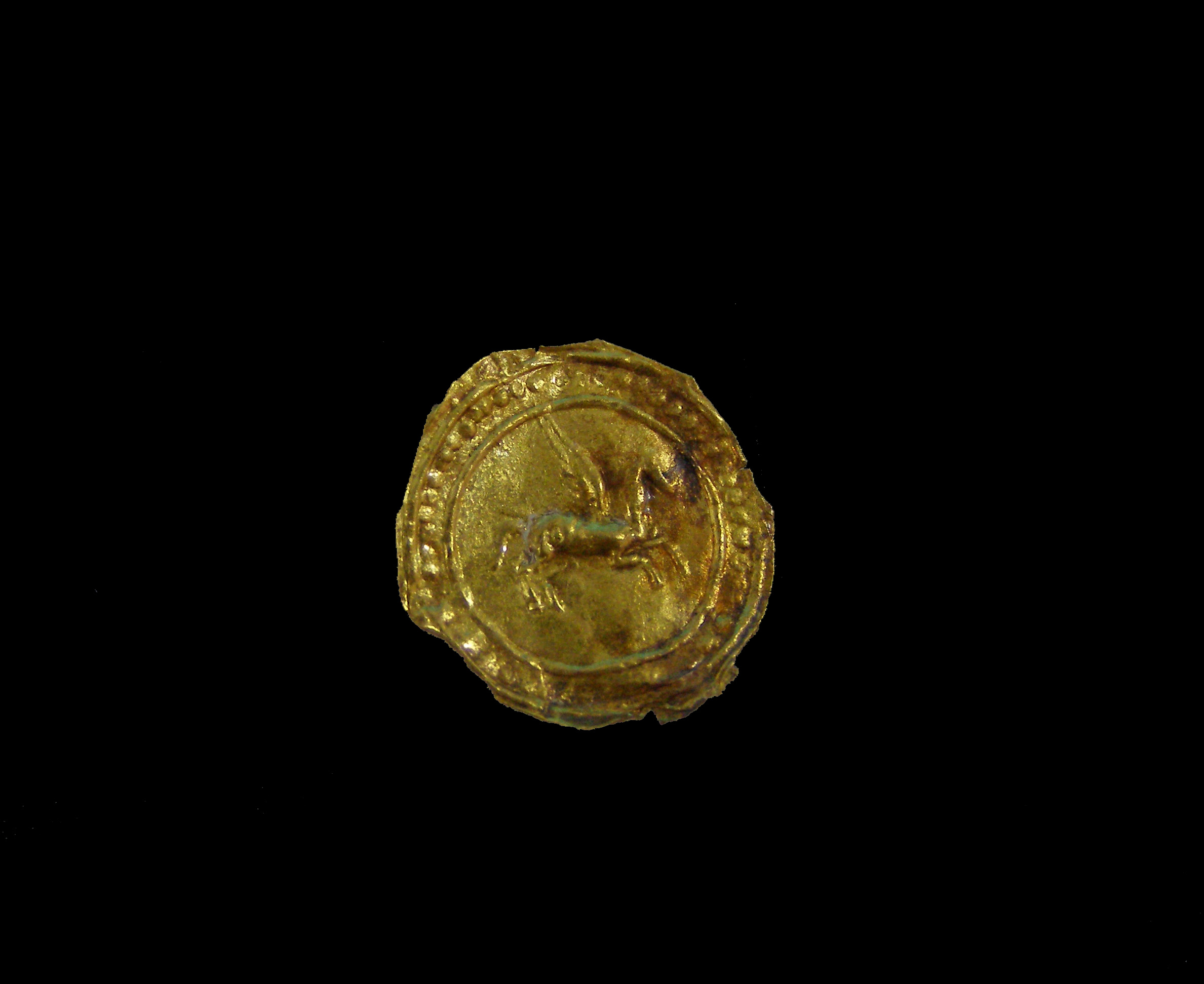 Χρυσή δανάκη, διακοσμημένη με έκτυπη παράσταση Πήγασου που ίπταται προς τα δεξιά. Το μυθικό άλογο, με τις ραδινές αναλογίες, βρίσκεται μέσα σε κυκλικό πλαίσιο φτιαγμένο από δύο ομόκεντρες έκτυπες γραμμές και σειρά έκκρουστων στιγμών ανάμεσα.