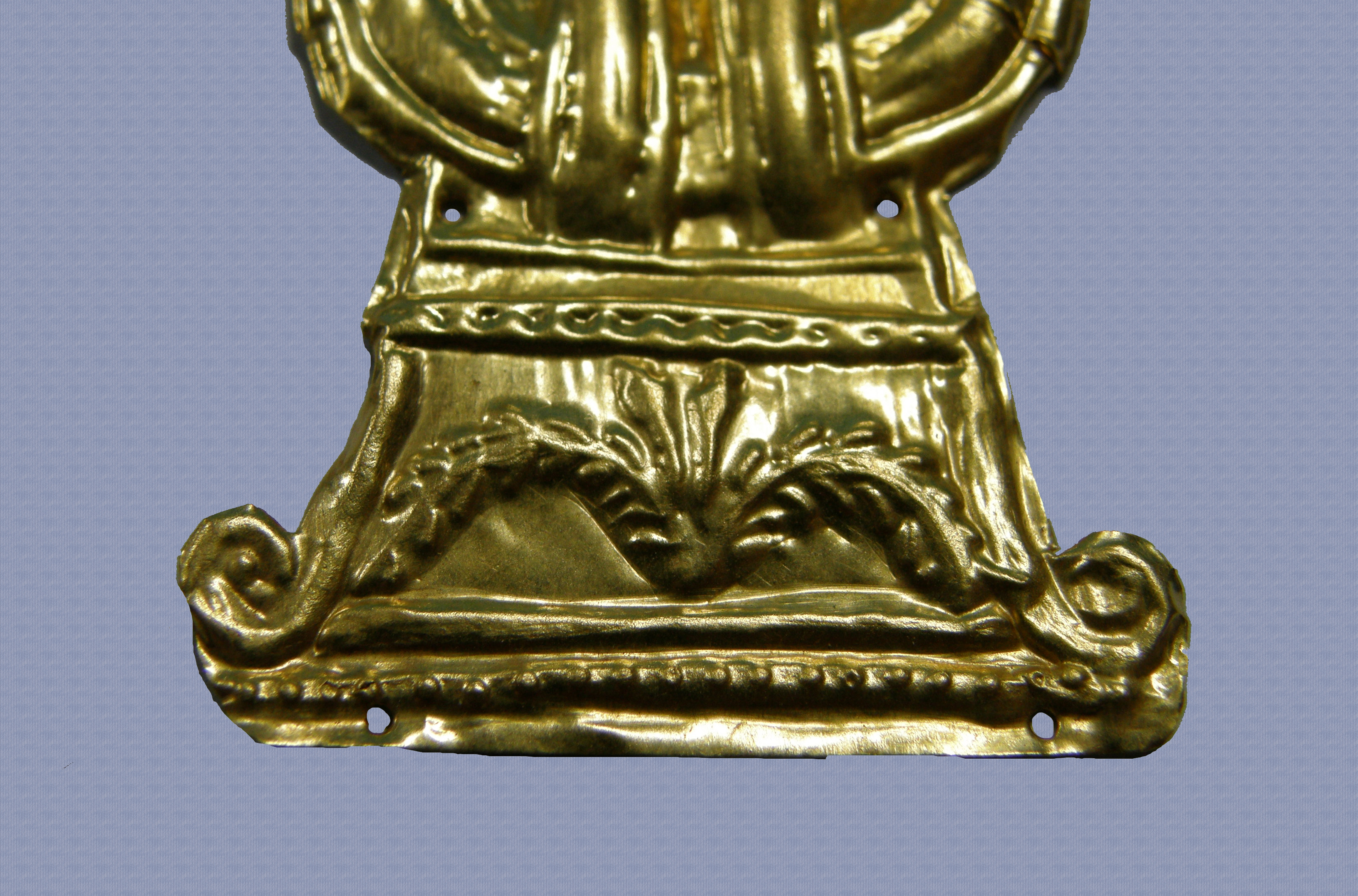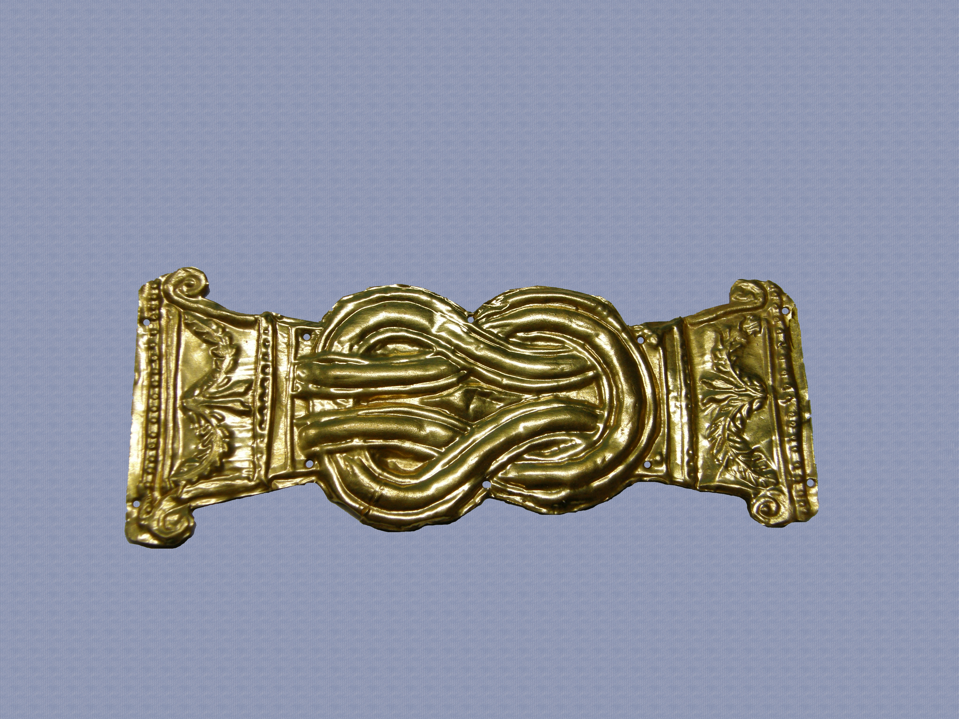 Χρυσό περίτμητο μακρόστενο έλασμα με διακόσμηση "ηράκλειου άμματος στο μέσον" ή "κόμπου του Ηρακλή", δηλαδή ενός σταυρόκομπου, και φυτικά μοτίβα εκατέρωθεν. Το κάθε μοτίβο πλαισιώνεται αριστερά και δεξιά από σειρά "χτυπητών" στιγμών και άνω και κάτω από οριζόντια υπερυψωμένη σπείρα. Το πλαίσιο μιμείται κορινθιακό επίκρανο. Φέρει από πέντε οπές πρόσδεσης στην κάθε μακρά πλευρά του.
