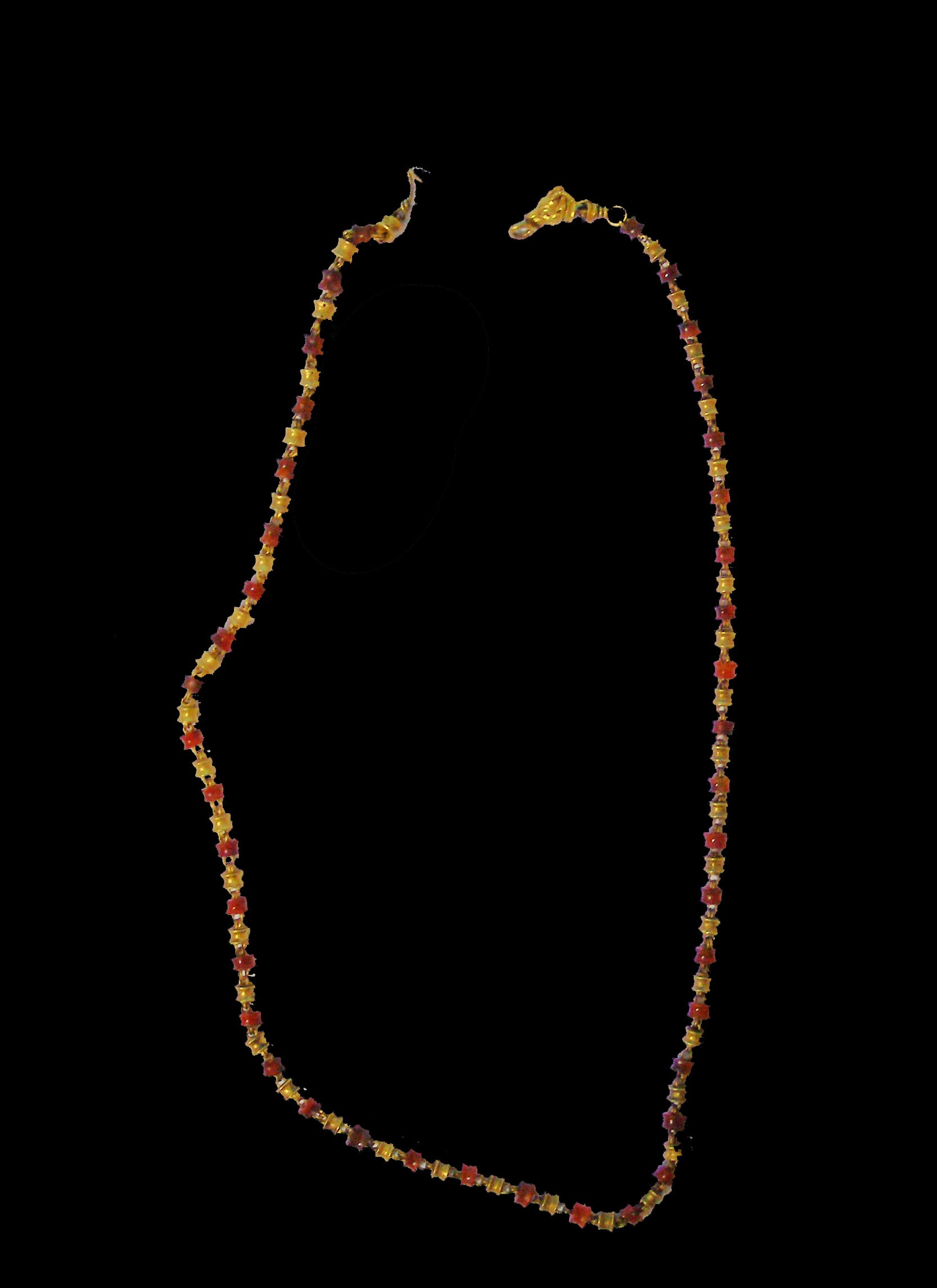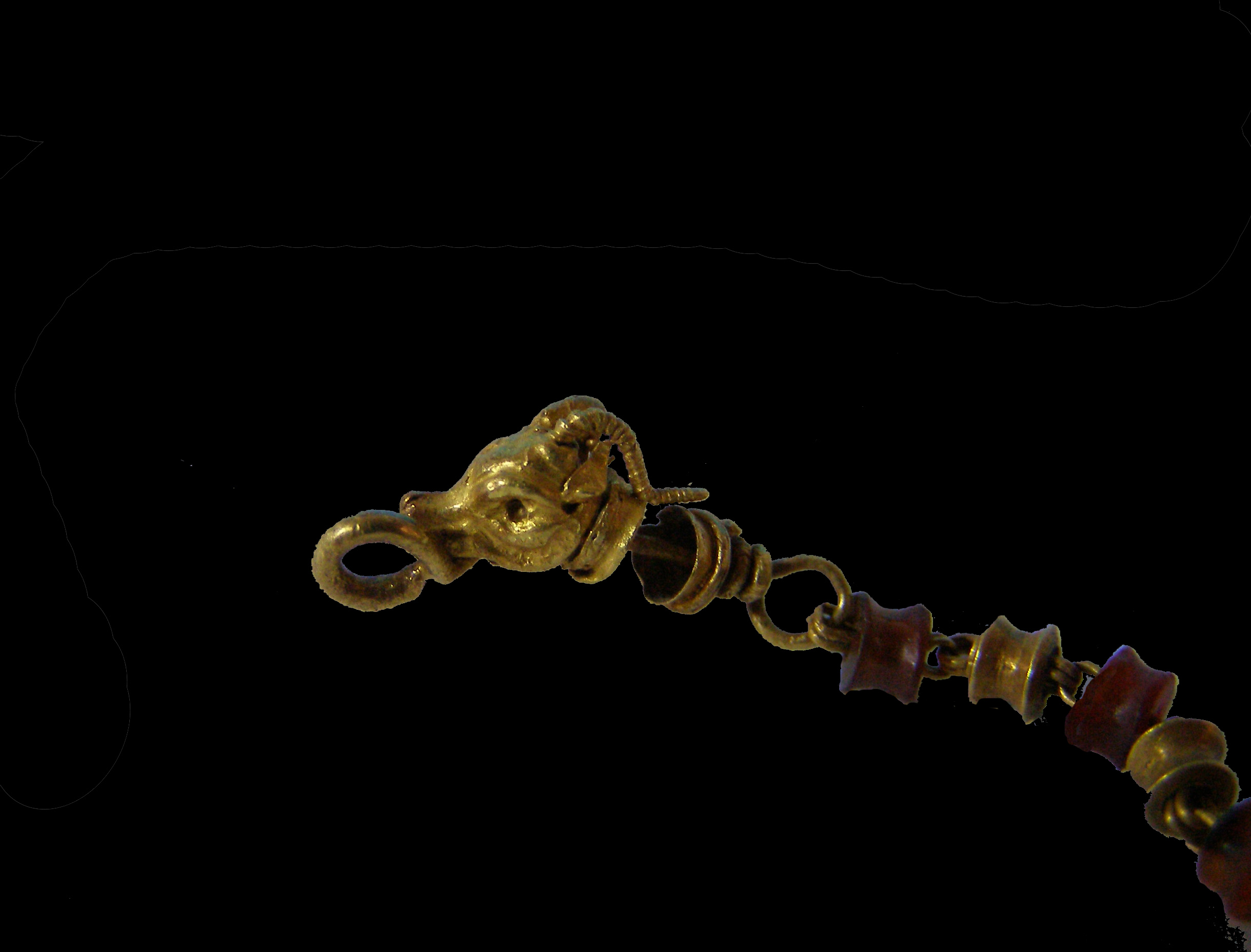 Περιδέραιο από χρυσό και καρνεόλη (ή κορνεόλη). Το ένα άκρο του λείπει. Αποτελείται από σαραντά μία (41) χάντρες σε σχήμα πηνίου από καρνεόλη και αντίστοιχα σαραντά μία (41) χάντρες σε σχήμα πηνίου από χρυσό, εναλλάξ τοποθετημένες. Οι χάντρες συνδέονται μεταξύ τους με διπλά κλειστά χρυσά άγκιστρα. Στο ένα άκρο η αλυσίδα απολήγει σε κεφαλή κριού, στο άλλο άκρο δε σώζεται τμήμα χρυσού αγκίστρου. Στο ένα άκρο η αλυσίδα απολήγει σε κεφάλι από κριό , ο οποίος στο στόμα έχει χρυσό κρίκο για την σύνδεση του περιδέραιο με το άλλο άκρο που έχει χρυσό άγκιστρο. Το κριάρι είναι λεπτομερώς αποδοσμένο και ο λαιμός του είναι επίσης απο καρνεόλη.