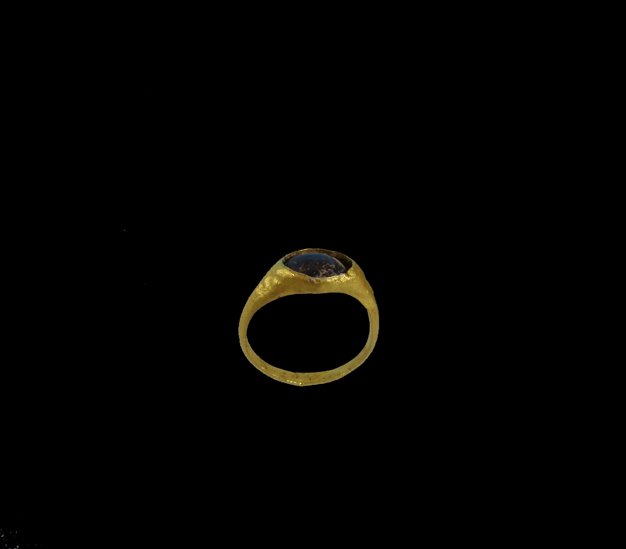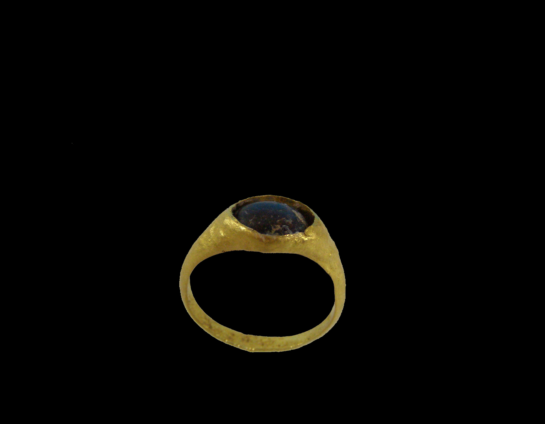 Χρυσός δακτύλιος. Αποτελείται από κρίκο ημικυκλικής διατομής, η στεφάνη του οποίου διευρύνεται στο πάνω μέρος σχηματίζοντας ωοειδή θήκη, όπου είναι τοποθετημένος λίθος από καρνεόλη.