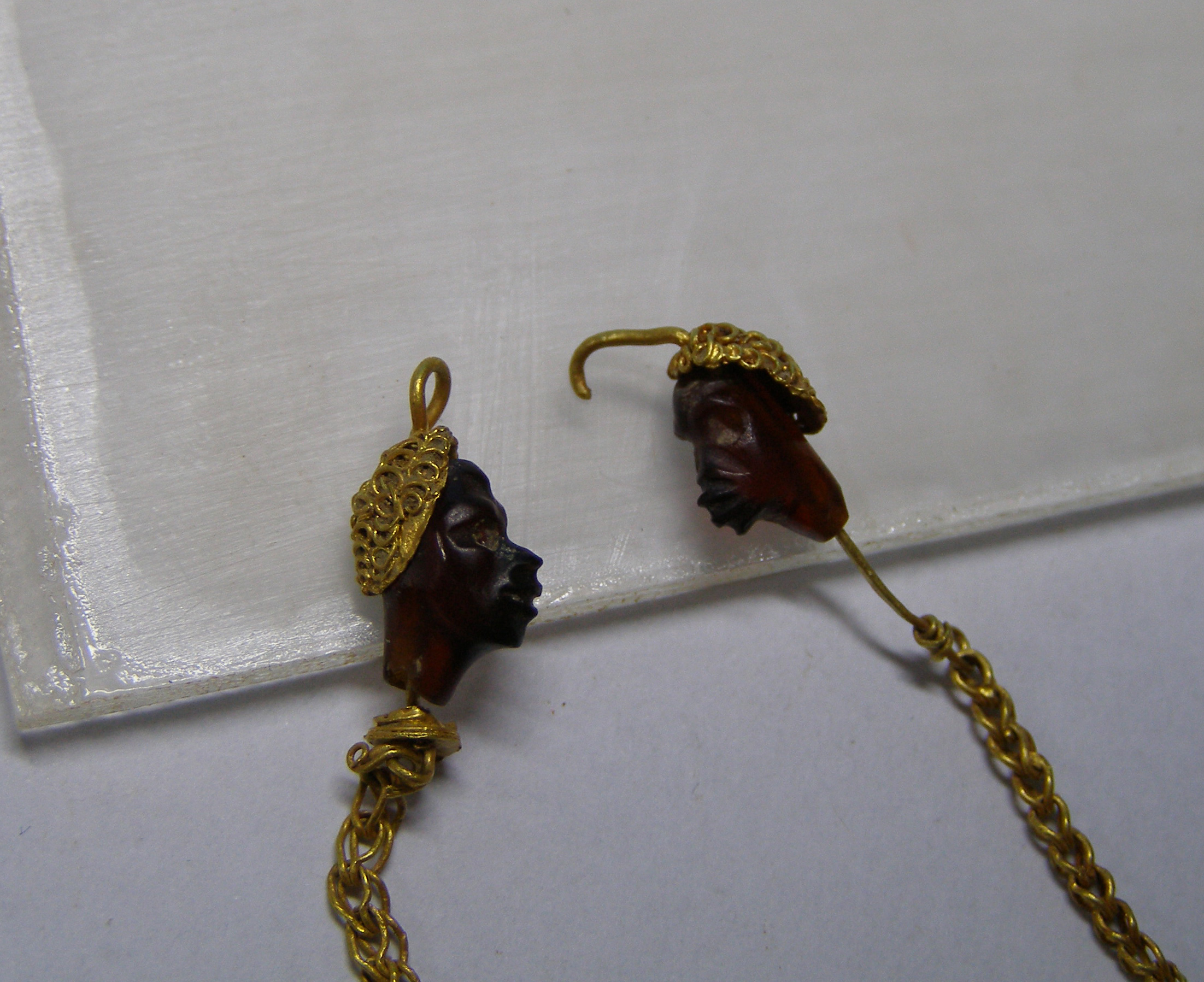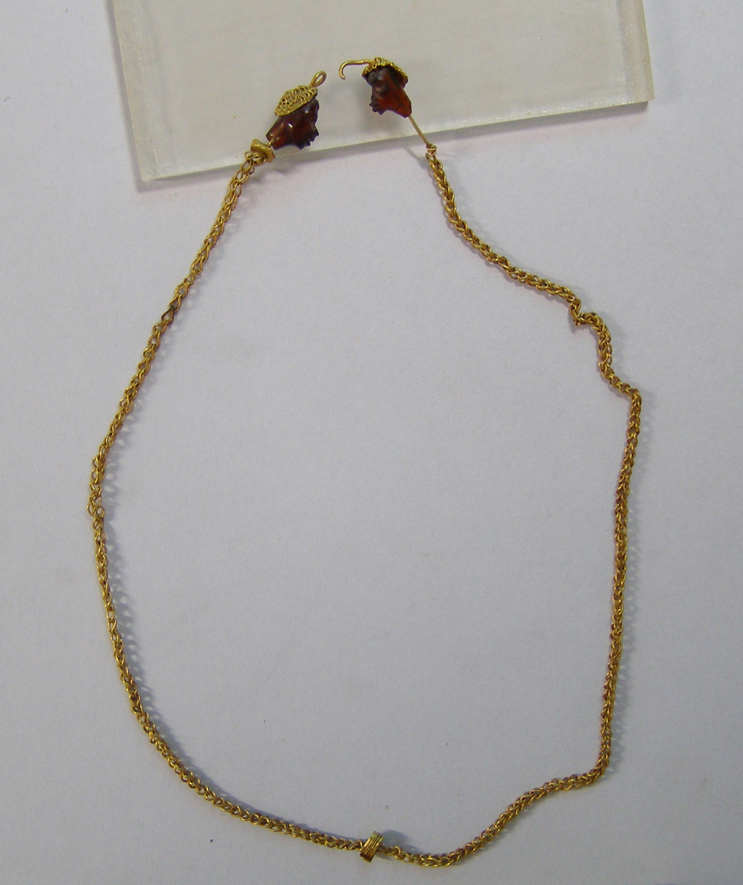 Ακέραια χρυσή αλυσίδα, αποτελούμενη από διπλά άγκιστρα διπλωμένα στο μέσον, που συνδέονται μεταξύ τους. Στα άκρα της απολήγει σε προτομές νέγρων: το κεφάλι τους είναι φτιαγμένο από καρνεόλη, ενώ ο λαιμός και τα μαλλιά τους από χρυσό. Η απόδοση των χαρακτηριστικών των μορφών των νέγρων είναι σαφής. Οι βόστρυχοι (μπούκλες) δηλώνονται με επίθετο χρυσό σύρμα, που περιελίσσεται πάνω σε καμπύλο χρυσό έλασμα. Καθεμία από τις προτομές έχει διαμπερή οπή, από όπου περνά χρυσό σύρμα, που απολήγει σε κλειστό κρίκο στη μια προτομή και ανοιχτό άγκιστρο στην άλλη, για την πόρπωση.