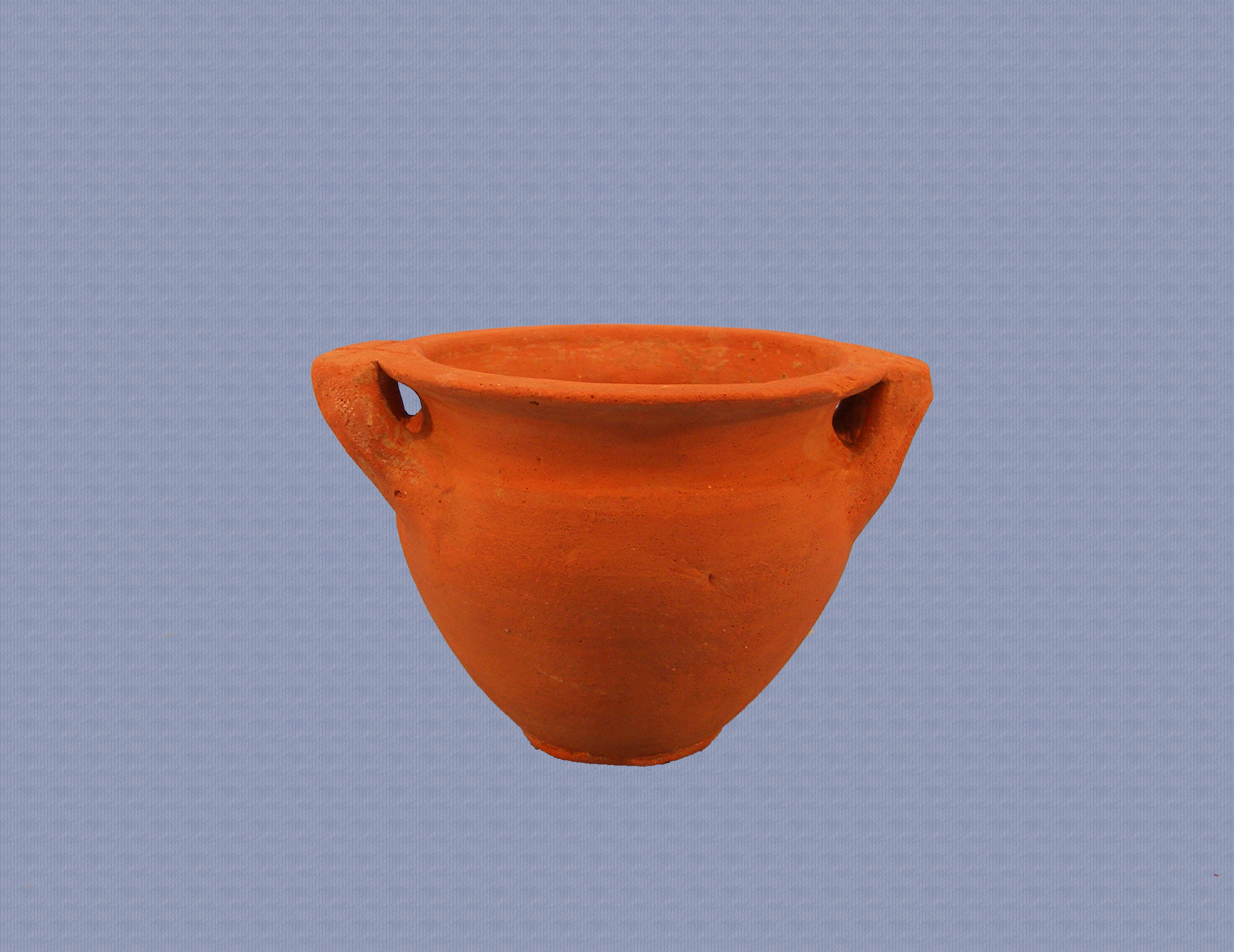 Άβαφος κρατήρας ακέραιος (εκτός από μικρές αποκρούσεις στο χείλος και στη βάση). Έχει χείλος πλατύ (πλ. 0,009 μ.), οριζόντιο. Το σώμα του είναι κωνικό, με καμπύλα τοιχώματα. Έχει λαβές κυλινδρικής διατομής, πεταλόσχημες, που υπερυψώνονται μέχρι το χείλος και εφάπτονται σε αυτό. Δημιουργείται έτσι ένθεν και ένθεν από μία πεπλατυσμένη επιφάνεια που κοσμείται με δύο έντονα εγχάρακτες γραμμές, τεμνόμενες χιαστί. Ο λαιμός του είναι βραχύς, κυλινδρικός και διαχωρίζεται με ισχυρή τμήση του περιγράμματος από το σώμα. Η βάση είναι δισκοειδής αλλά κακότεχνη. Σε τρία σημεία παρατηρούνται ατέλειες στην επιφάνεια του αγγείου.