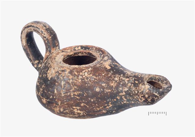 Ακέραιος μελαμβαφές λυχνος με λαβή. Φέρει βάση δισκόμορφη με κοίλη την κάτω επιφάνεια έδρασης και σώμα με κωνικό περίγραμμα. Η λαβή είναι κάθετη ταινιωτή υπερυψωμένη, ενώ ο μυκτήρας μακρύς με τριγωνική απόληξη. Αβαθής περιφερής δακτύλιος ορίζει την οπή πλήρωσης. Σώζεται γάνωμα θαμπό κατά τόπους απολεπισμένο.