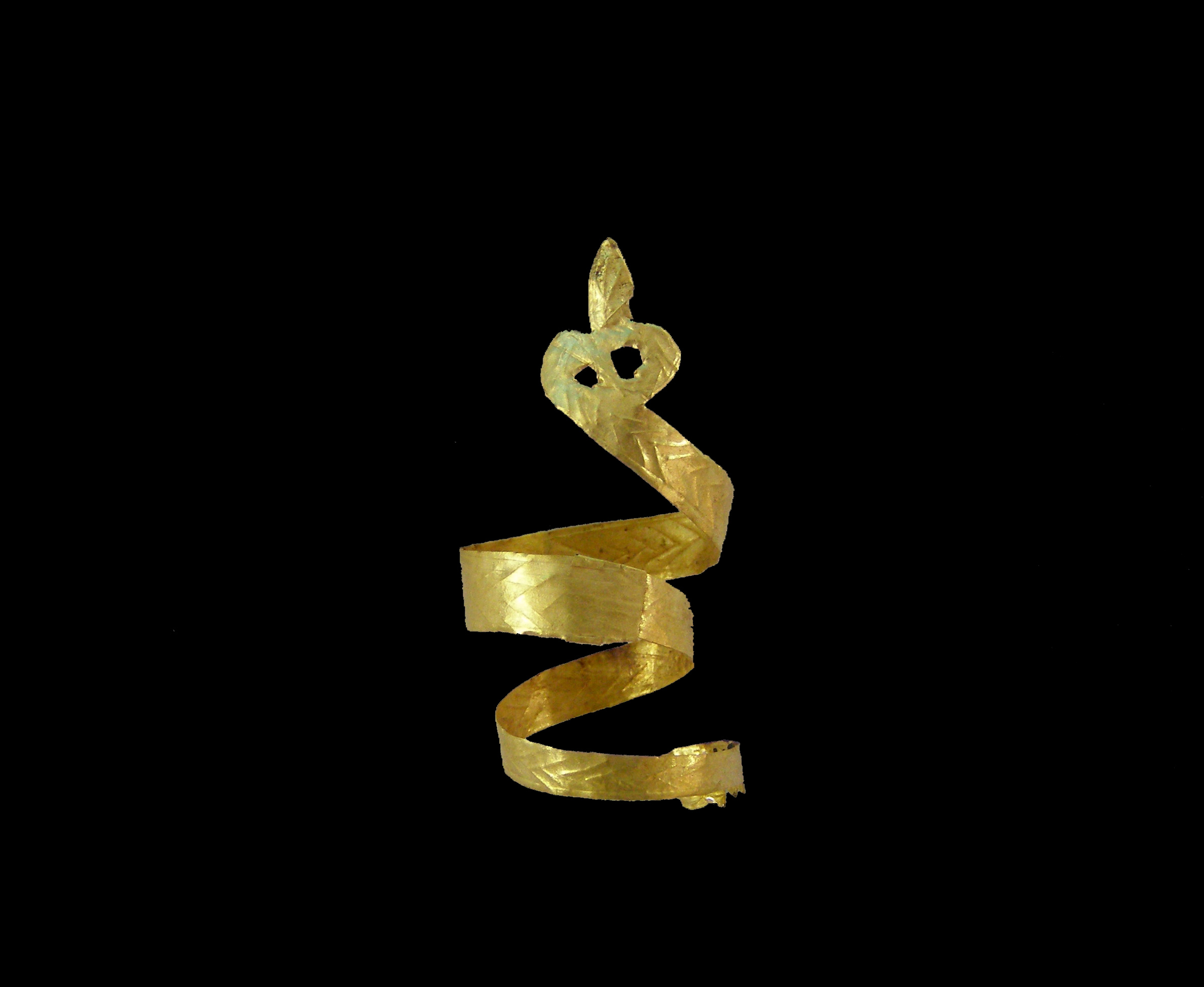 Χρυσός πολύσπειρος ελασμάτινος δακτύλιος με τριπλή περιέλιξη, αποτελούμενος από δύο συγκολλημένα ελάσματα. Στο ένα άκρο του έχει στρογγυλεμένη απόληξη και οπή πρόσδεσης. Το άλλο άκρο του ελίσσεται σιγμοειδώς και απολήγει σε περίτμητη κεφαλή φιδιού. Κατά μήκος, το έλασμα είναι διακοσμημένο με έκτυπο μοτίβο ιχθυάκανθας.