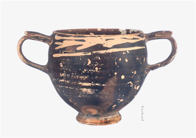 Ακέραιος μελαμβαφής κάνθαρος με διακόσμηση τύπου "Δυτικής Κλιτύος". Φέρει βάση δακτυλιόσχημη με κωνικό περίγραμμα, κοίλη επιφάνεια έδρασης και κωνικό έξαρμα στο κέντρο της, η οποία μεταβαίνει ομαλά στο σώμα με αβαθή αυλάκωση. Το σώμα είναι ημισφαιρικό επίμηκες απολήγει σε ελαφρώς εσωστρεφές χείλος. Οι λαβές είναι κάθετες, ταινιωτές με πλαστικό επίμηκες επιπεδόμορφο επίθημα στην άνω επιφάνεια. Στη ζώνη ανάμεσα στις λαβές, ακριβώς κάτω από το χείλος, φέρει οριζόντια φυλλόσχημη ταινία στο χρώμα του πηλού.