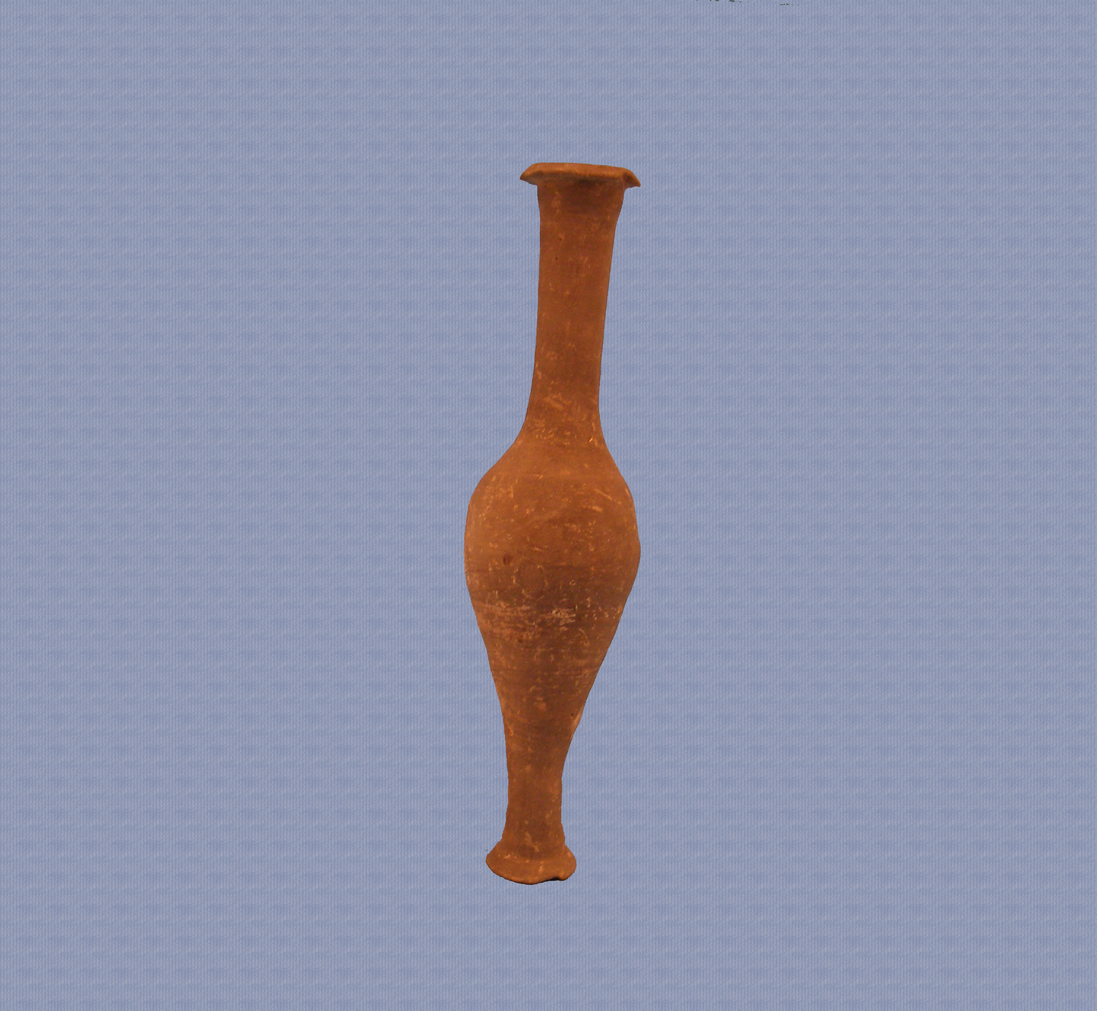 Ατρακτόσχημο μυροδοχείο, αποκεκρουμένο περιμετρικά του χείλους και της βάσης. Έχει χαμηλή κωνική βάση και πόδι που σχηματίζει έξεργα ένα δεύτερο μικρότερο τμήμα. Το πόδι είναι μεν λεπτό αλλά έχει έντονη κλίση λόγω κακοτεχνίας. Το σώμα είναι ατρακτόσχημο, με περίγραμμα που δεν είναι συνεχές. Η επιφάνεια δεν είναι λεία, αλλά παρουσιάζει βαθουλώματα λόγω άτεχνου πλασίματος. Ο λαιμός είναι πολύ ψηλός και το χείλος λοξότμητο. Σε ορισμένα σημεία καλύπτεται από επικαθήσεις.