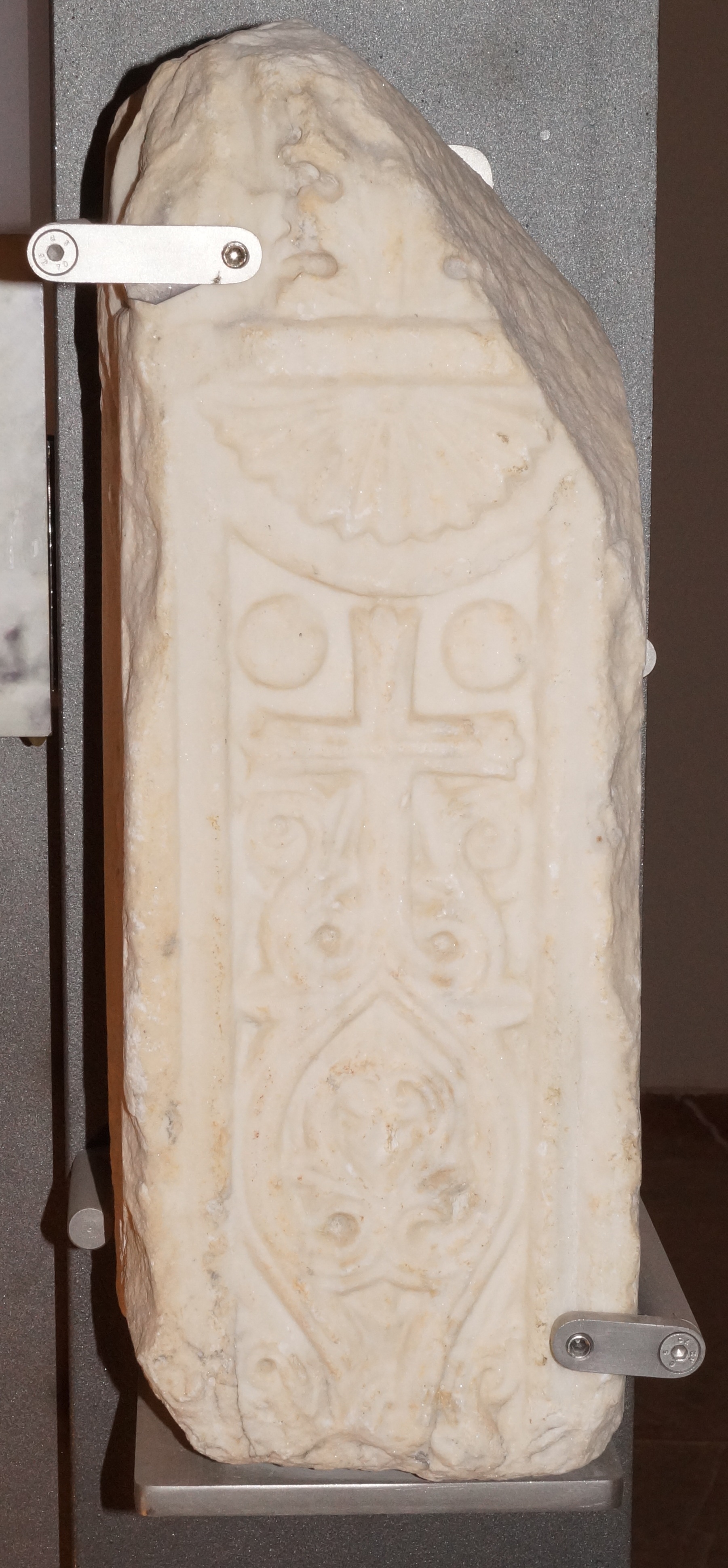 Πεσσίσκος τέμπλου μετά συμφυούς κιονίσκου αποκεκρούμενου κατά τα άκρα . Επί της πρόσθιας όψεως ανάγλυφος διάκοσμος ελικοφύλλων συμπλεκόμενων σε κόμβους και απολήγουν σε φυλλοφόρων σταυρό με δυο κύκλους στις άνω γωνίες .Εις το άνω μέρος του κιονίσκου ριπιδοειδές κόσμημα και εις το κάτω του συμφυούς κιονίσκου άκανθα.