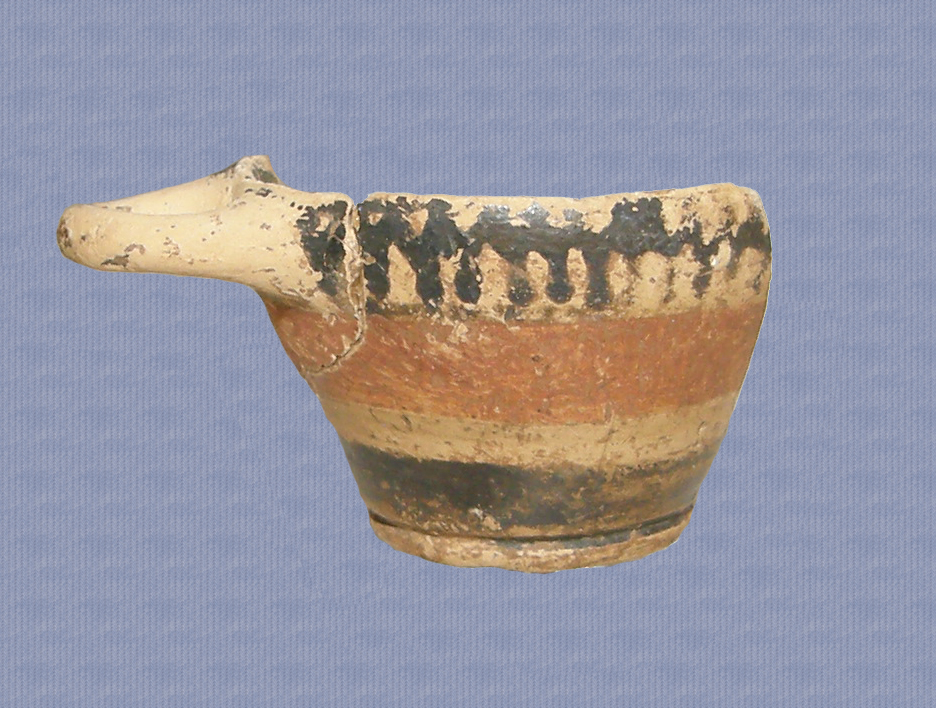 Μικρογραφική κοτύλη, ελλιπής κατά το ήμισυ του σώματος και τη μία λαβή, και συγκολλημένη από δύο όστρακα. Είναι αρκετά καλοφτιαγμένη, με πολύ χαμηλή δακτυλιόσχημη και ελαφρά κωνική βάση, σώμα με κάθετα, σχεδόν, τοιχώματα, που κλίνουν ελαφρώς προς τα μέσα στο χείλος. Δακτυλιόσχημη, οριζόντια μελανόχρωμη λαβή, στο ύψος, περίπου, του χείλους. Διατηρεί, εσωτερικά, μελανό επίχρισμα και εξωτερικά δύο οριζόντιες, περιφερείς ταινίες καστανού και καστανόκκινου χρώματος (από πάνω προς τα κάτω, αντίστοιχα), και κάθετες, τεθλασμένες μελανόχρωμες γραμμές στη ζώνη των λαβών.