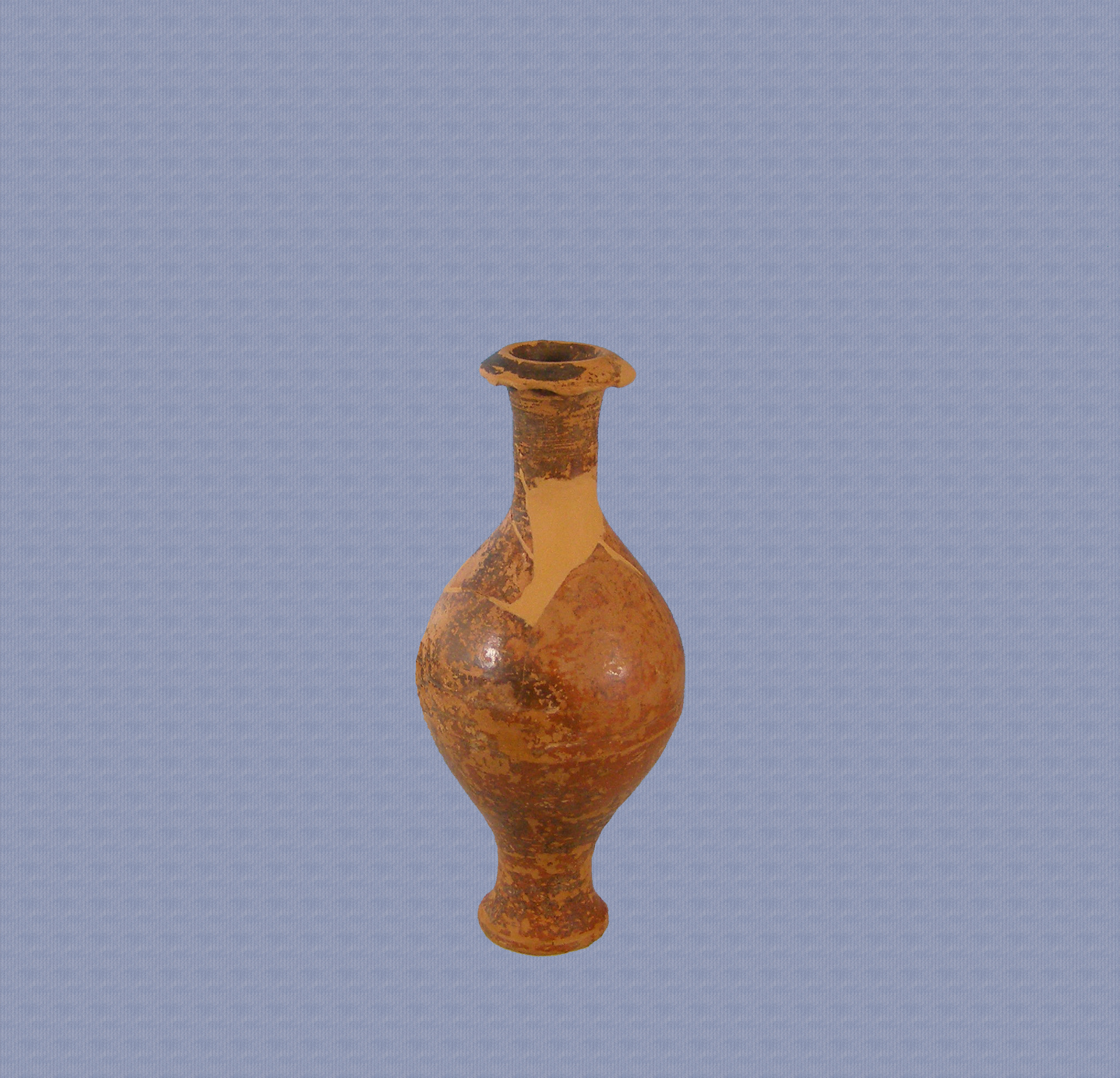 Μυροδοχείο με δακτυλιόσχημη βάση, χαμηλό πόδι, σφαιρικό σώμα, κυλινδρικό λαιμό και λοξότμητο χείλος. Φέρει καστανέρυθρο γάνωμα κατά τόπους απολεπισμένο. Το σώμα διατρέχουν οριζόντιοι και παράλληλοι εγχάρακτοι δακτύλιοι.