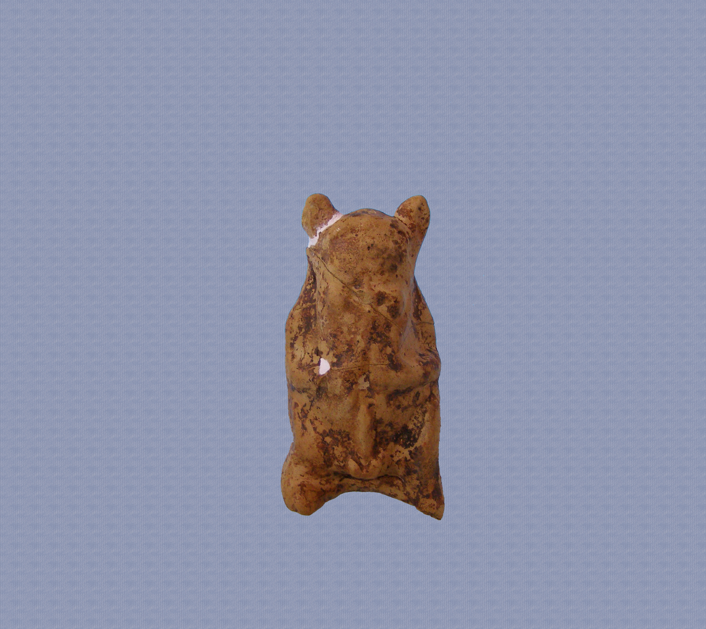 Πήλινο ειδώλιο Πάνα. Η μορφή απεικονίζεται καθιστή, να παίζει ένα πνευστό μουσικό όργανο που αποτελείται από δύο αυλούς, τον δίαυλο. Όπως σε όλες τις απεικονίσεις του Πάνα, έτσι και στη συγκεκριμένη παρουσιάζεται έντονο το ιθυφαλλικό στοιχείο (απεικόνιση με ανορθωμένο φαλλό). Τα χαρακτηριστικά του προσώπου του, με τα γένια, δεν διακρίνονται από λεπτότητα, αντίθετα είναι χονδροειδή. Χαρακτηριστικά τα δύο κέρατα κατσίκας που προεξέχουν στο κεφάλι του.