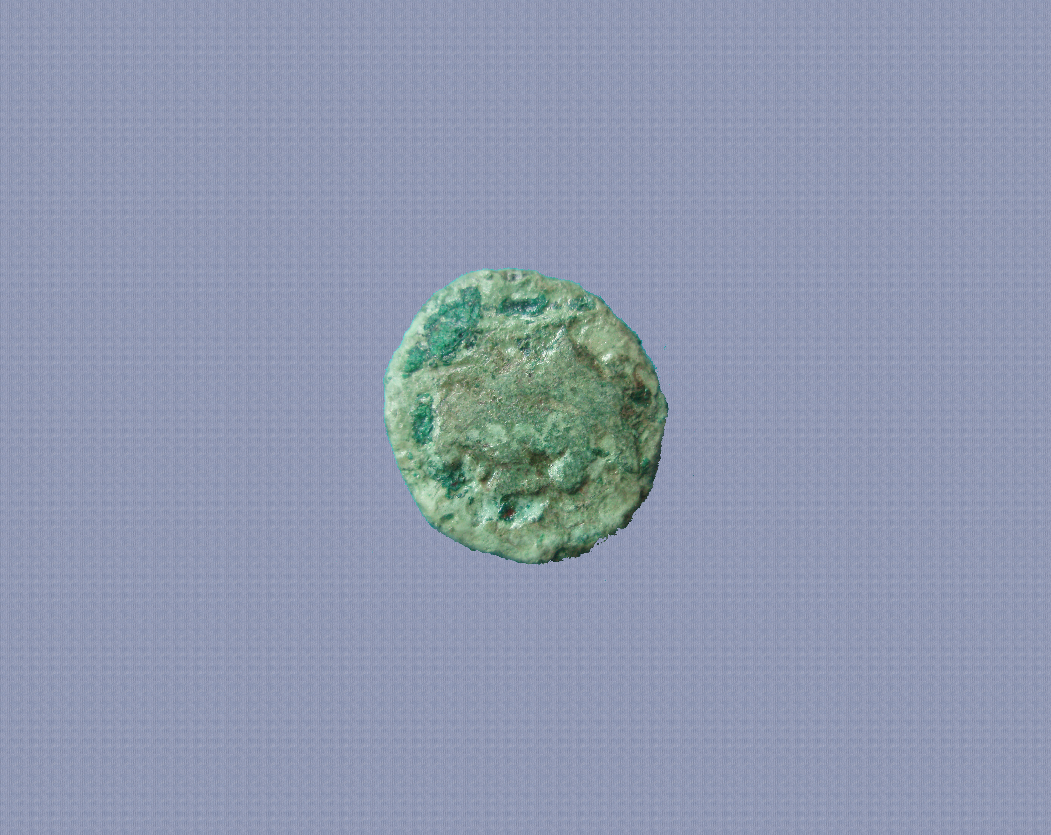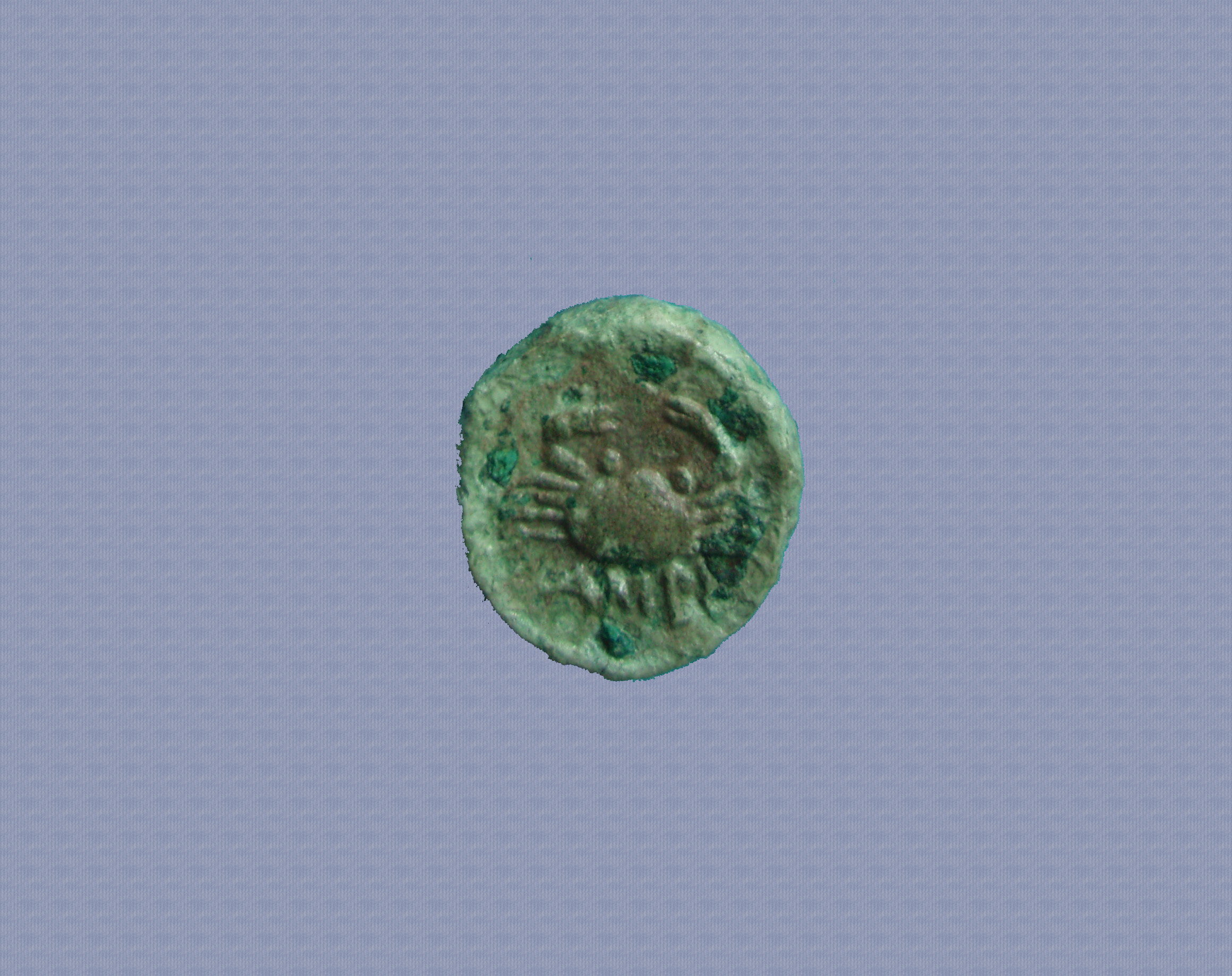 Νόμισμα Αμβρακίας, Εμπροσθότυπος: δυσανάγνωστη κεφαλή ποτάμιου θεού, Αράχθου ή Αχελώου, προς τα δεξιά Οπισθότυπος: καρκίνος και κάτω από αυτόν στο έξεργο τα αρχικά "ΑΜΒ[Ρ]"