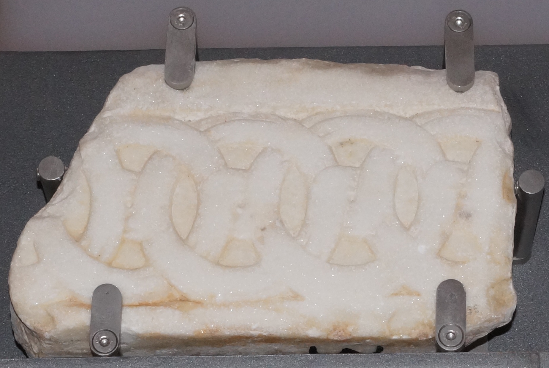 Τμήμα επιστυλίου με ανάγλυφη παράσταση συμπλεκόμενων συρικών τροχών. Αποκεκρουμένο κατά τη στενή και κατά τη μια μακρά πλευρά. Φθαρμένη η επιφάνεια πιθανώς γιατί χρησίμευε ως βαθμίς. Πιθανότατα τμήμα του επιστυλίου του τέμπλου του διακονικού.