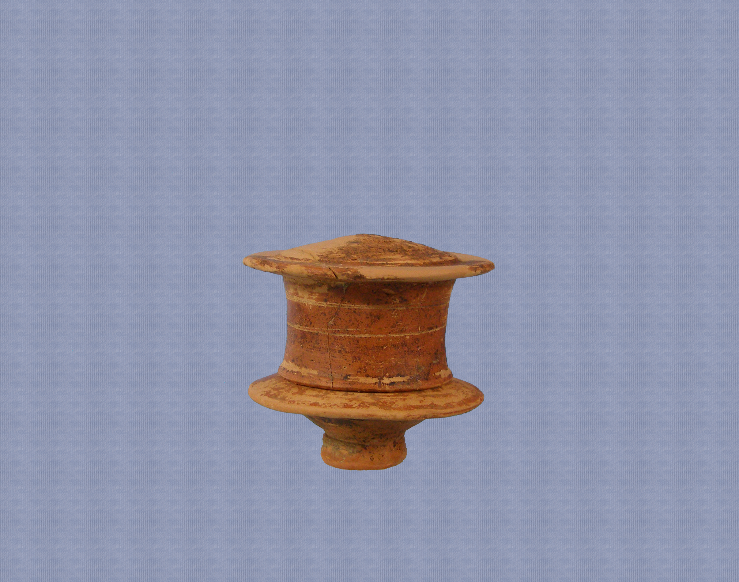 Πυξιδίσκη με πώμα, με καστανέρυθρο γάνωμα, εσωτερικά και εξωτερικά. Το σώμα είναι κυλινδρικό,με τοιχώματα που κλίνουν ελαφρώς προς το εσωτερικό και ψηλή δακτυλιόσχημη βάση. Στο κατώτερο τμήμα του σώματος, στη μετάβαση από τη βάση προς το σώμα, φέρει δισκοειδή περιφερή προεξοχή. Το πώμα έχει κυλινδρικά τοιχώματα και ανεπαίσθητα θολωτή την άνω επιφάνεια. Έχει περιφερή δισκοειδή προεξοχή, ομοία με εκείνη του σώματος. Το πώμα έχει συμπληρωθεί και συγκολληθεί απο πολλά θραύσματα.