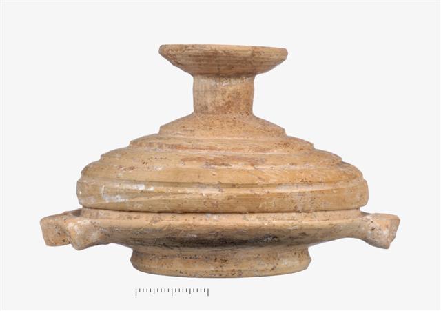 Ακέραιη μικρογραφική λεκανίδα με πώμα. Φέρει βάση δακτυλιόσχημη και σώμα αβαθές, εσωτερικά σχεδόν επίπεδο με προεξέχον τμήμα στο χείλος για τη στήριξη του πώματος. Οι λαβές είναι οριζόντιες ταινιωτές, τα άκρα των οποίων σχηματίζουν πλαστικές αποφύσεις. Το πώμα -σε σχήμα θόλου- φέρει την άνω επιφάνεια βαθμιδωτά διαμορφωμένη με μια οριζόντια αυλάκωση στο κατώτερο τμήμα. Το κομβίο είναι κωνικό, αποτελείται από κυλινδρικό στέλεχος με κοιλότητα στο κέντρο. Σώζονται ίχνη ερυθρού χρώματος στην άνω επιφάνεια του πώματος. Το χρώμα του πηλού είναι πολύ ανοιχτό καστανό προς κιτρινωπό.