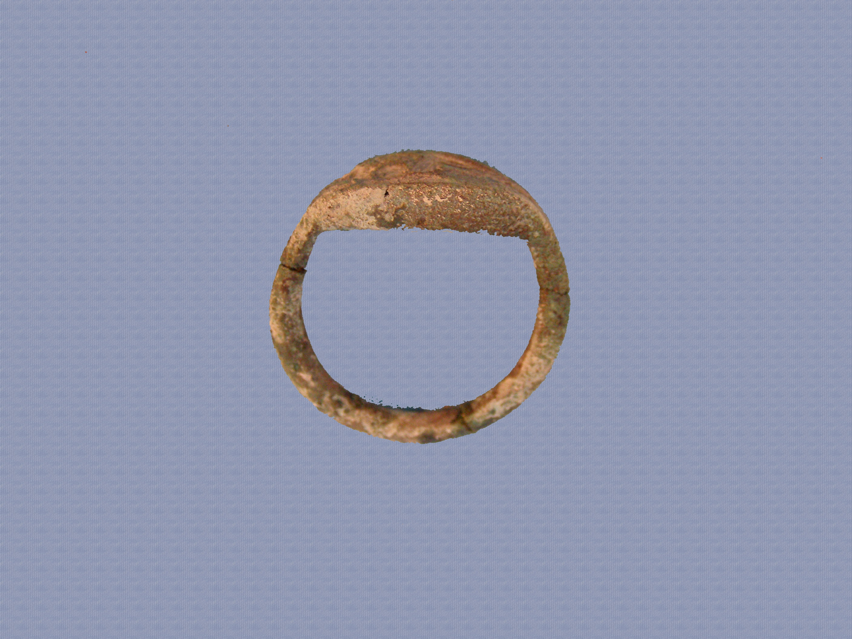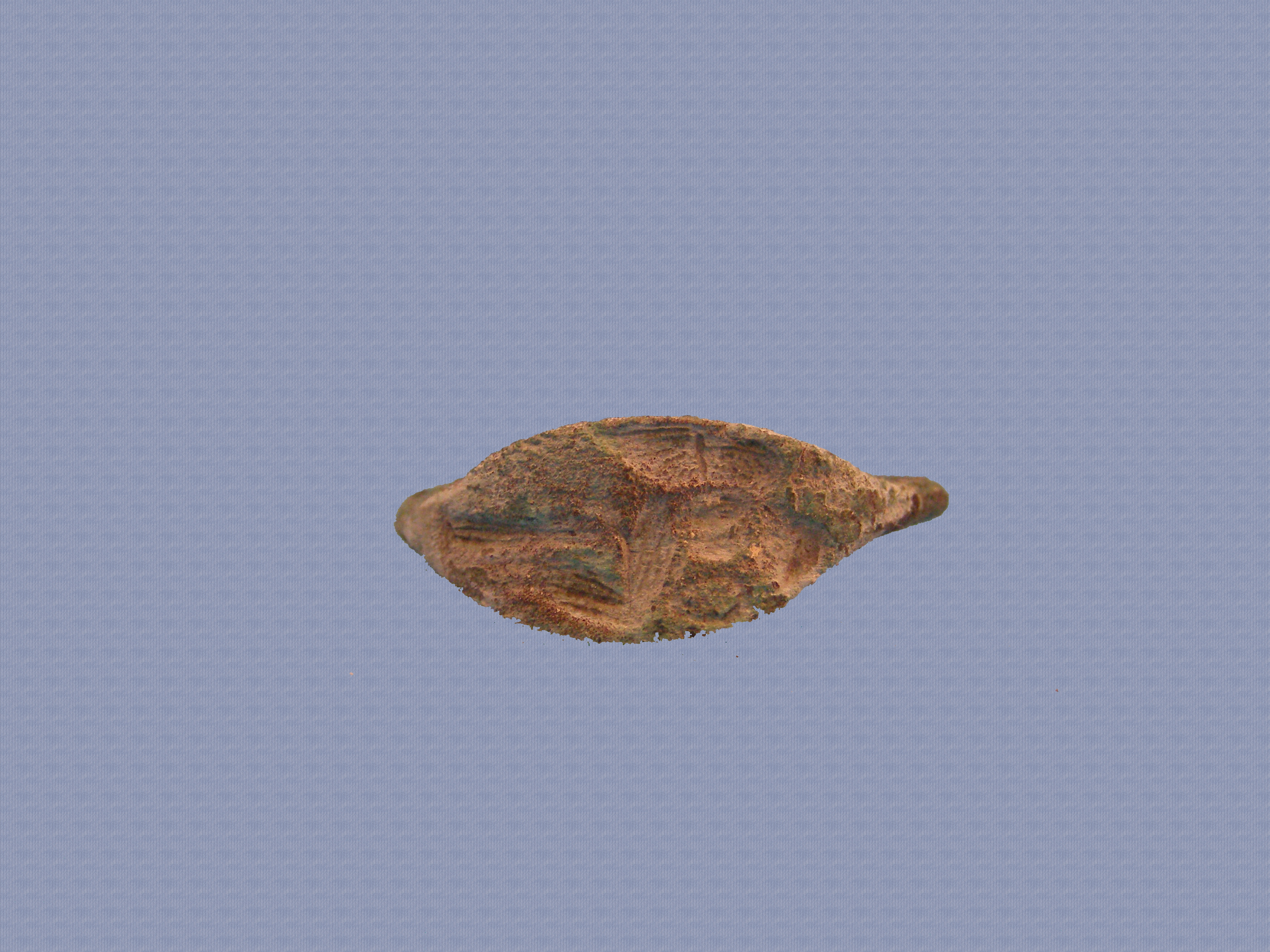 Χάλκινος δακτύλιος. Κρίκος κυκλικής διατομής. Συμφυής, ελλειψοειδής σφενδόνη με ελαφρά κοίλη την άνω επιφάνεια, όπου δυσανάγνωστη παράσταση. Στη μία κατακόρυφη πλευρά του φέρει τρεις κυκλικές οπές.