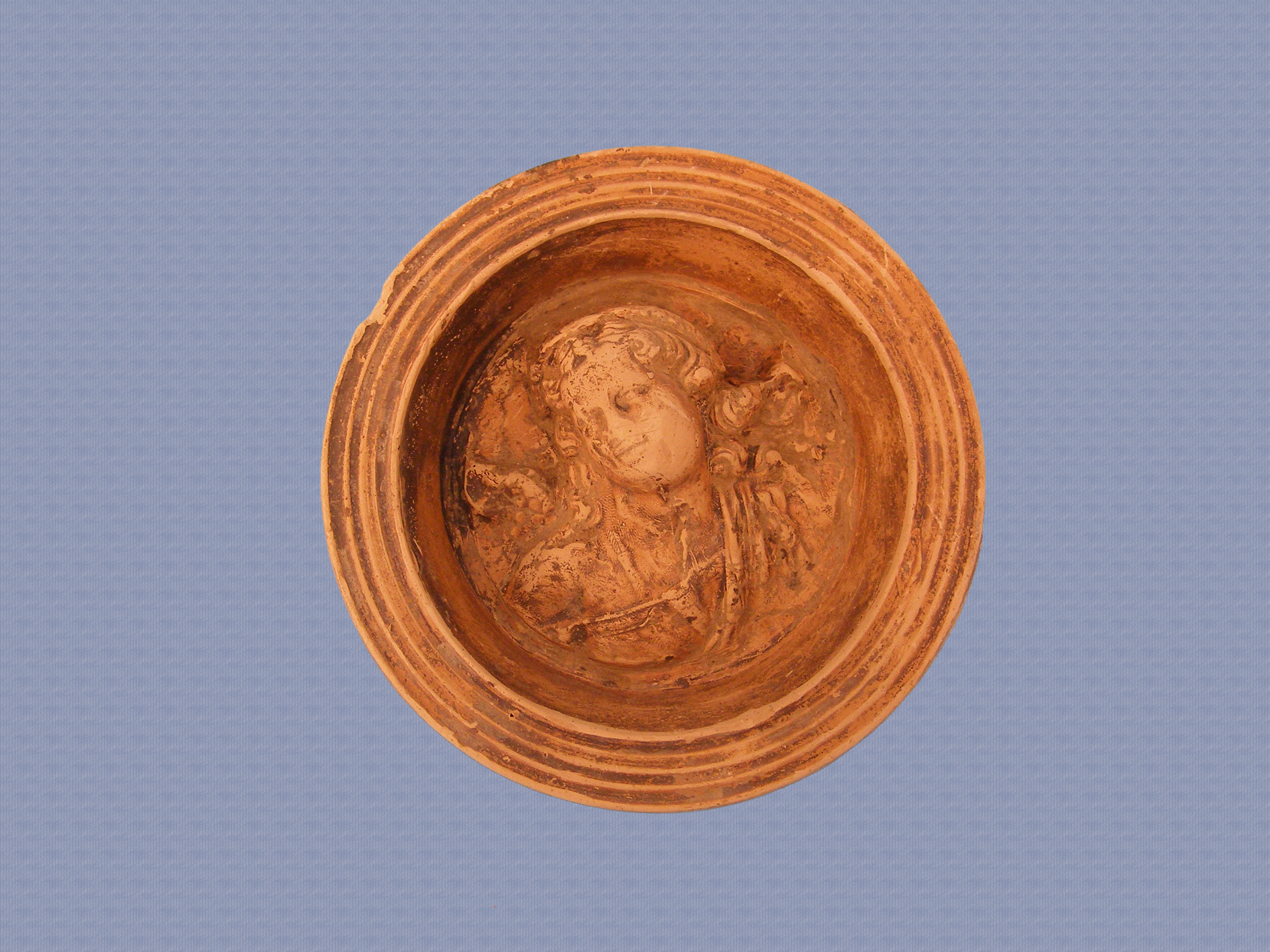 Ο πυθμένας του πινακίου κοσμείται με ανάγλυφη παράσταση ερωτιδέα (ο θεός Έρωτας σε μικρή ηλικία) σε προτομή. Ο νεαρός θεός παριστάνεται κατ' ενώπιον, με τον κορμό τεταμένο προς τα εμπρός και το κεφάλι στραμμένο ελαφρώς προς τα πάνω και δεξιά. Το πρόσωπό του είναι ωοειδές, με σαρκώδη μάγουλα και ευκρινή χαρακτηριστικά. Τα μαλλιά του είναι μακριά, κυματιστά, ενώ στο κεφάλι φορά κυλιστό στέφανο. Φοράει ιμάτιο, ριγμένο στον αριστερό ώμο. Οι ιμάντες του τόξου και της φαρέτρας δηλώνονται πλαστικά, στον κορμό.