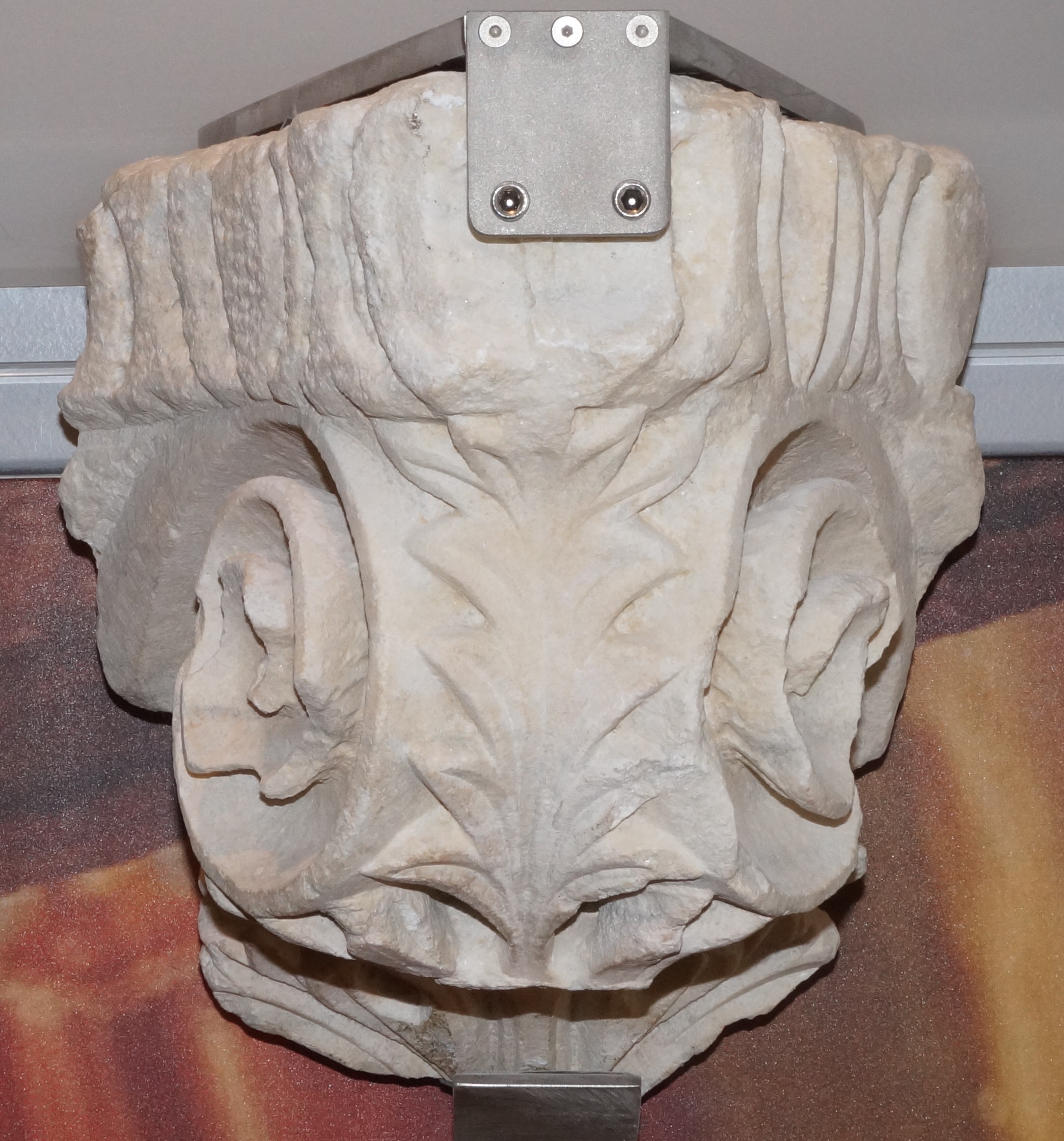 Τμήμα μαρμάρινου κιονόκρανου, γωνιακό. Φέρει ανάγλυφη διακόσμηση ελίκων στις πλευρές ενώ στο σημείο που γωνιάζει η επιφάνεια καλύπτεται από φύλλο ακάνθης. Στον άβακα φέρει διακόσμηση ωών.