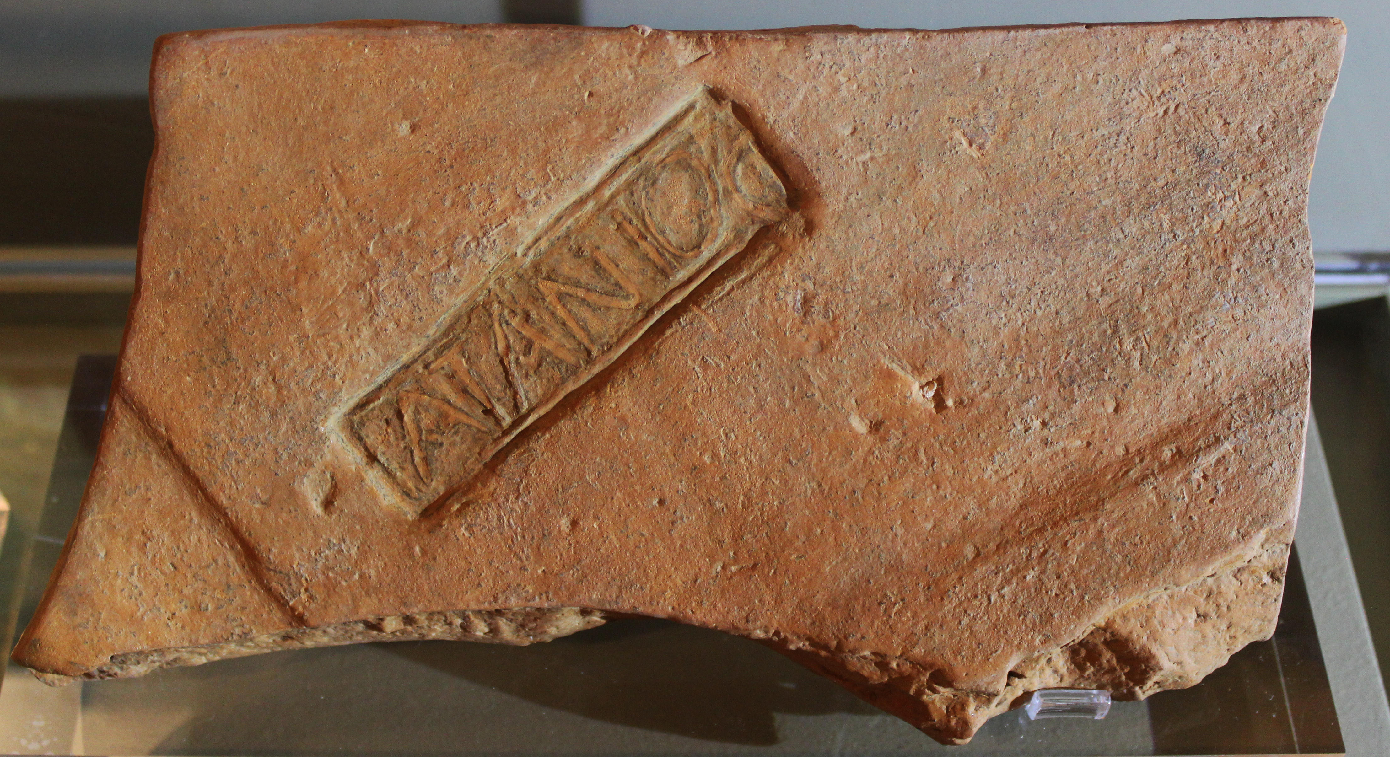 Τμήμα ενσφράγιστης κεράμου λακωνικού τύπου, χρήση ως καλυπτήριας τάφου. Φέρει στο μέσον περίπου ορθογώνιο σφράγισμα 0,101μ. x 0,028μ. με την επιγραφή ΑΤΑΝΙΟC από αριστερά προς τα δεξιά.