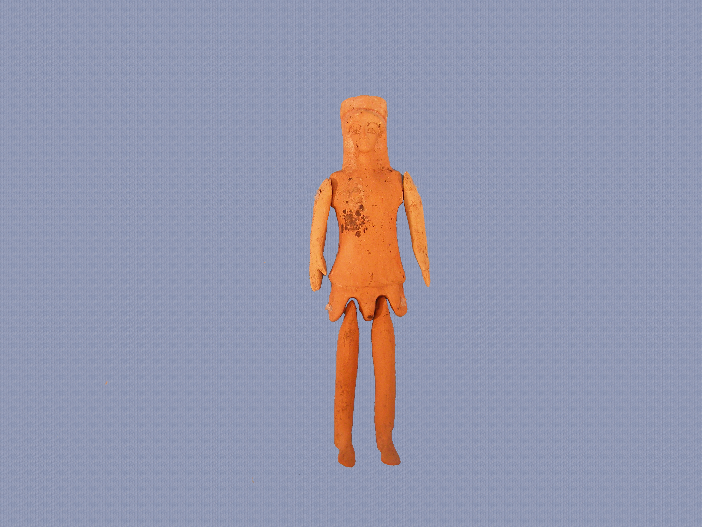 Ειδώλιο πλαγγόνας. Ακέραιο (τα άνω άκρα πιθανόν να μην συνανήκουν, καθώς έχουν διαφορετικό χρώμα πηλού απο το υπόλοιπο ειδώλιο). Φορά κοντό χιτωνίσκο και πόλο στην κεφαλή που διατηρεί ίχνη ερυθρού χρώματος στην πρόσθια επιφάνεια και φέρει οπή στο πάνω μέρος. Η πίσω όψη ειναι επίπεδη. Συντηρημένο. Τα άνω και κάτω άκρα (κινούμενα μέλη) έχουν προσαρτηθεί με πετονιά κατά τη συντήρηση.