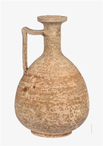 Οινοχόη ακέραιη και συγκολλημένη από πολλά κομμάτια.Φέρει βάση δακτυλιωτή, σώμα απιόσχημο, λαιμό κυλινδρικό στενό με ευρύ κάθετο χείλος και λαβή ραβδωτή, γωνιώδη. Φέρει καστανέρυθρο γάνωμα, απολεπισμένο κατά τόπους.