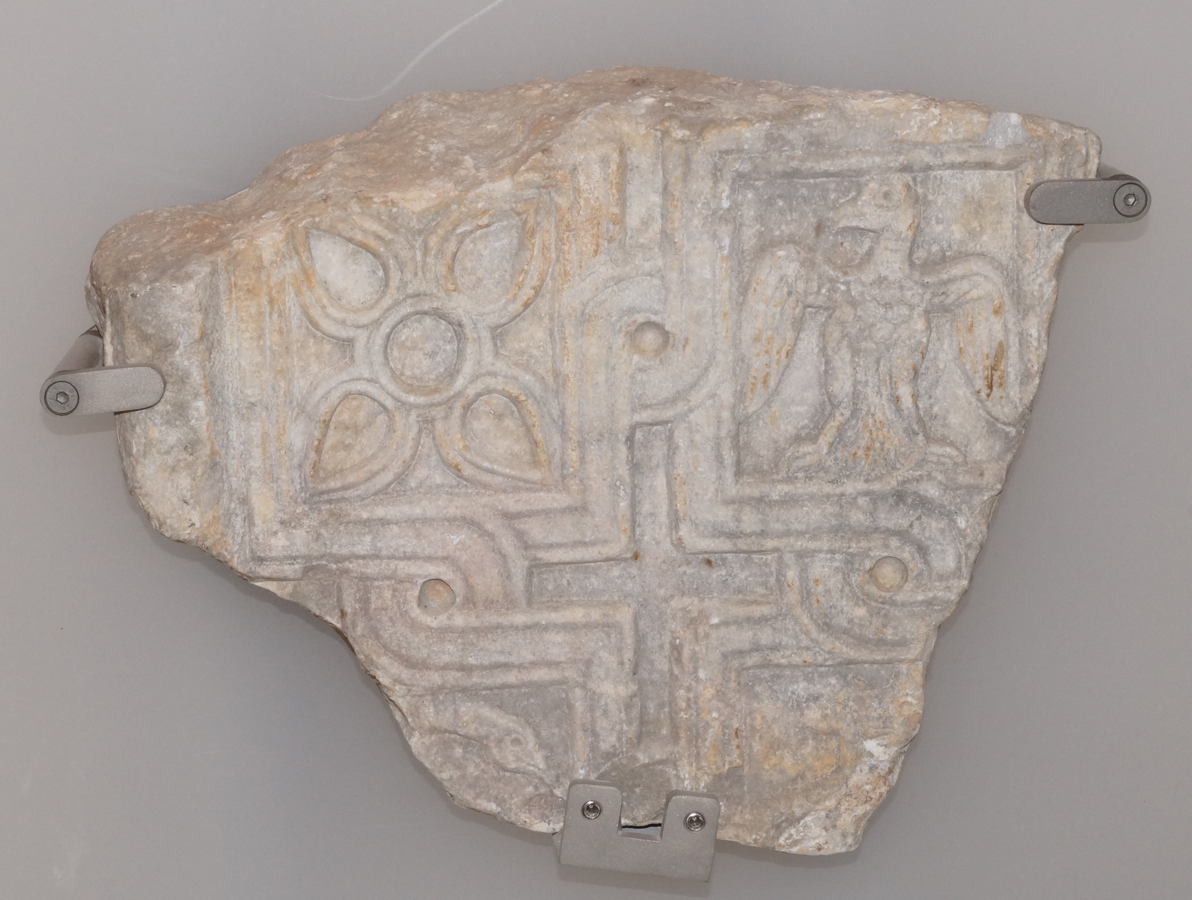 Τμήμα ανάγλυφου θωρακίου, αποκεκρουμένο άνω, δεξιά, κάτω και κάτω αριστερά. Φέρει διακόσμηση τετραγώνων συμπλεκόμενων με κόμβους, εντός των οποίων εικονίζονται πτηνά και γεωμετρικά σχήματα.