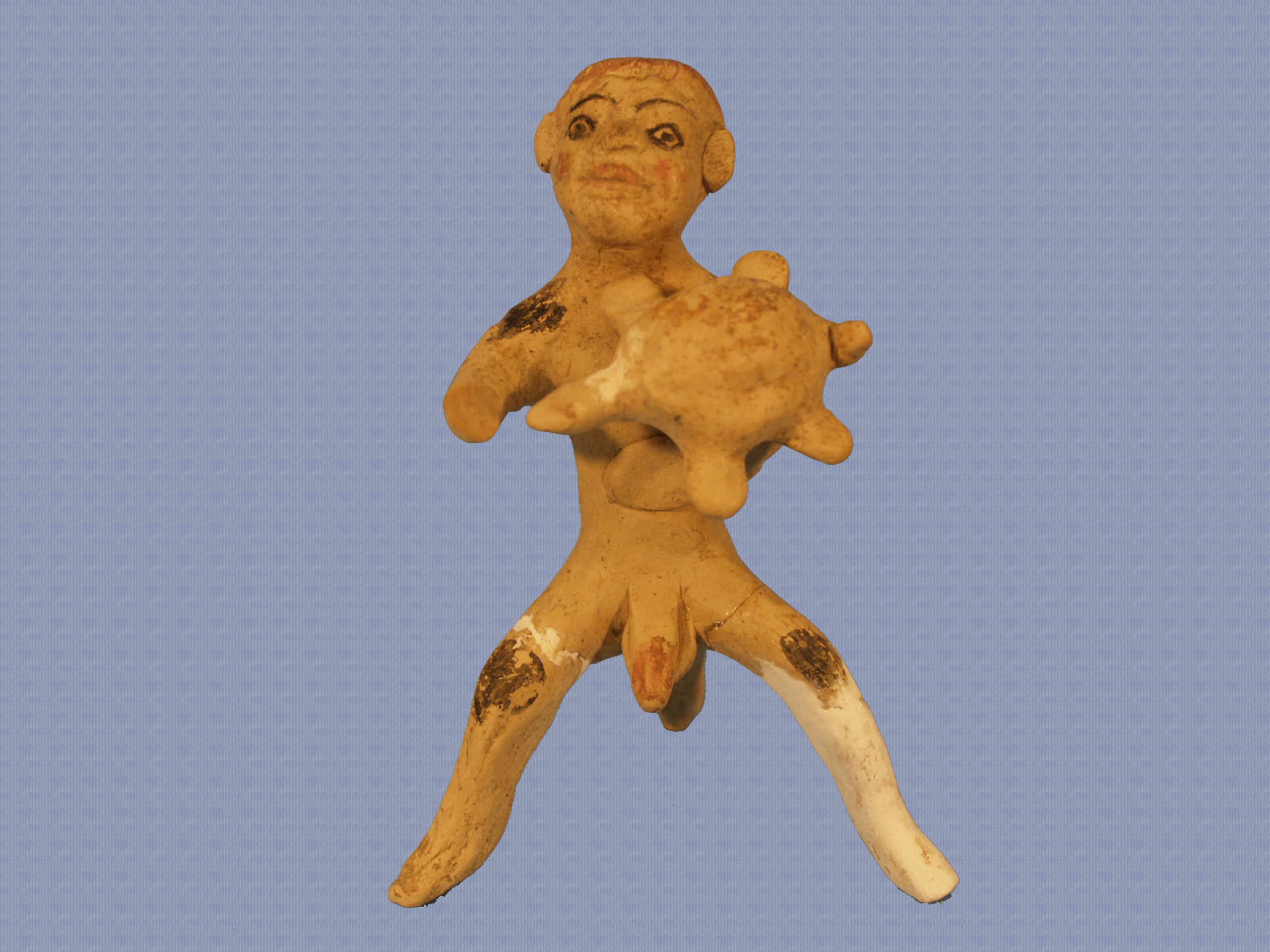 Ειδώλιο ανδρικής μορφής που κρατά χελώνα, συμπληρωμένο στο κάτω αριστερό άκρο. Σε στάση καθιστή και με πόδια σε διάσταση, το ειδώλιο στηρίζεται σε στήριγμα στο πίσω μέρος. Σώζει κόκκινο χρώμα στα μαλλιά, τα μάγουλα, το στόμα και τα γεννητικά όργανα. Μελανές στιγμές τονίζουν τα γόνατα και τους ώμους. Με χρώμα αποδίδονται και τα χαρακτηριστικά του προσώπου.