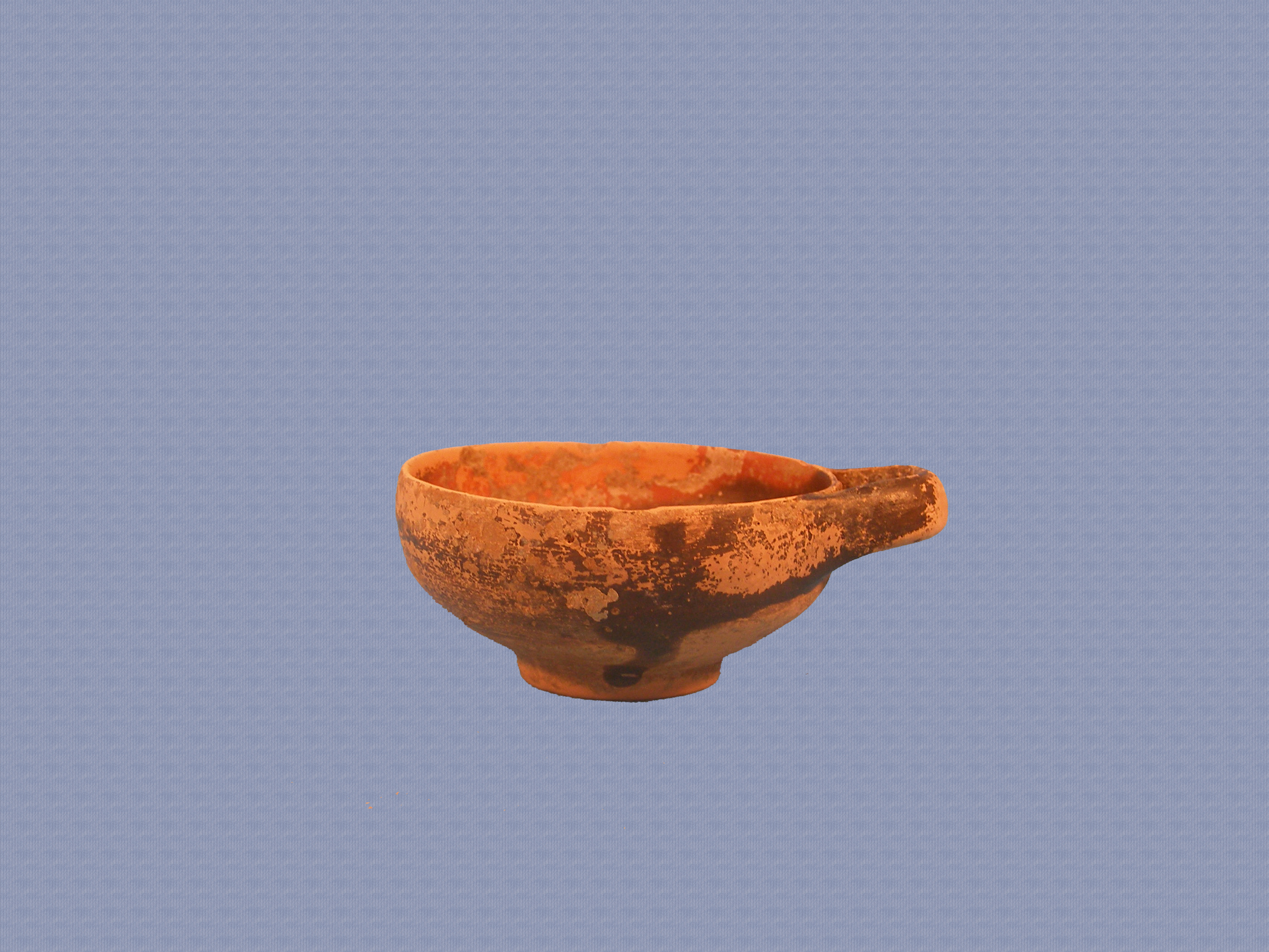 Μόνωτο κυάθιο, ακέραιο (φέρει μόνο μικρές αποκρούσεις περιμετρικά του χείλους). Λαβή οριζόντια ταινιόσχημη. Το σώμα είναι βαθύ με καμπύλο συνεχές περίγραμμα ως τη μετάβαση προς τη δισκοειδή βάση, όπου παρατηρείται θλάση. Εσωτερικά το κυάθιο καλύπτει καστανομέλανο γάνωμα ενώ εξωτερικά καλύπτει τη λαβή μια ανισοπλατής ζώνη μέχρι το ήμισυ περίπου του ύψους του. Σε κάποιο σημείο, λόγω της ρευστότητας του χρώματος αυτό έχει τρέξει μέχρι τη δισκοειδή βάση. Στο εσωτερικό ο πυθμένας σχηματίζει κυκλική κοιλότητα.