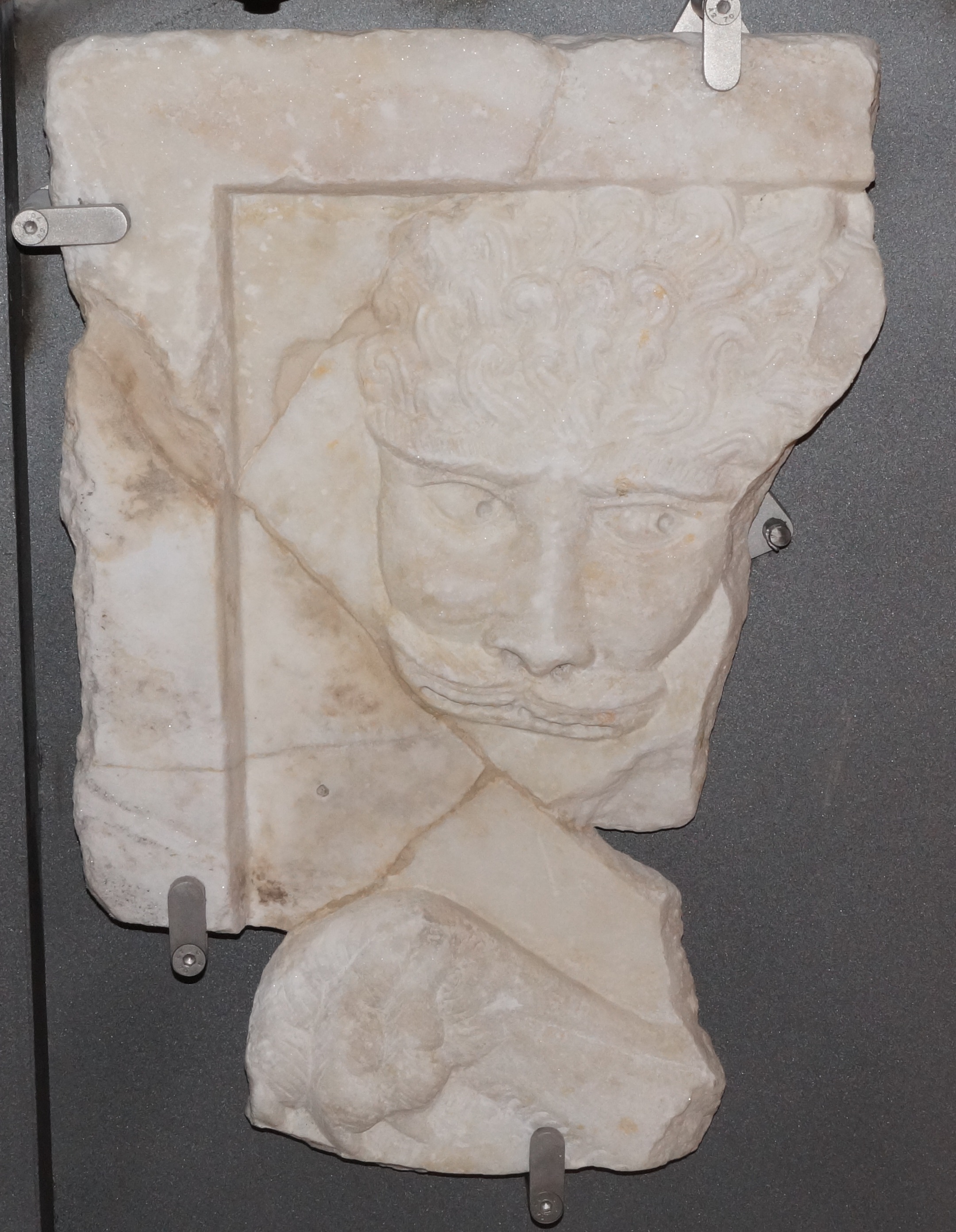 Τμήμα μαρμάρινου θωρακίου συγκολλημένο από τέσσερα θραύσματα. Σώζεται αποσπασματικά ανάγλυφη κεφαλή λιονταριού κατά μέτωπο που στρέφει τα μάτια αριστερά και τμήμα του ποδιού.