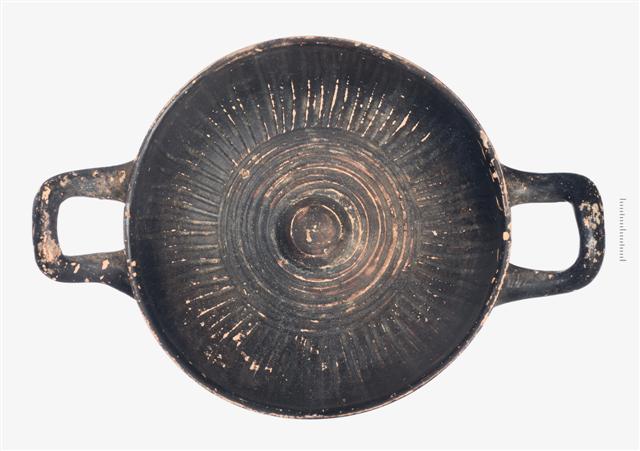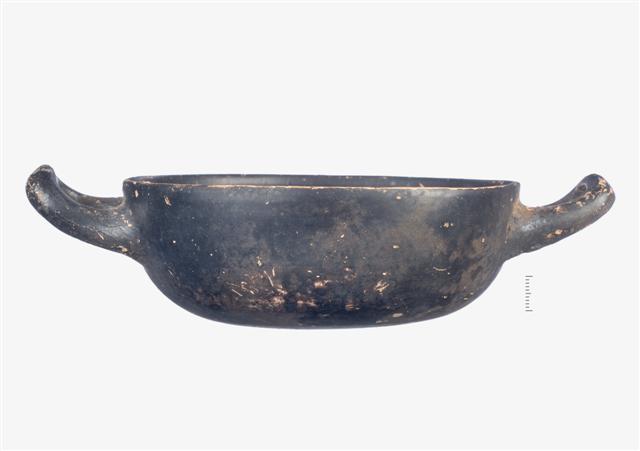 Ακέραιη μελαμβαφής κύλικα χωρίς πόδι. Φέρει βάση επίπεδη με κοίλη την επιφάνεια έδρασης, σώμα βαθύ και κάθετο χείλος. Οι λαβές είναι οριζόντιες κυλινδρικές, οι άκρες των οποίων έχουν κλίση προς τα πάνω. Στον πυθμένα φέρει έξι αβαθείς κυκλικές αυλακώσεις γύρω από τον ομφαλό. Η υπόλοιπη εσωτερική επιφάνεια σώζει αυλακώσεις σε ακτινωτή διάταξη από τον πυθμένα προς το χείλος. Του γανώματος εξαιρείται η κοιλότητα της επιφάνειας έδρασης του αγγείου. Σώζει γάνωμα στιλπνό, στην εξωτερική, κυρίως, επιφάνεια -κατά τόπους- αραιό ερυθρού ή φαιού χρώματος.