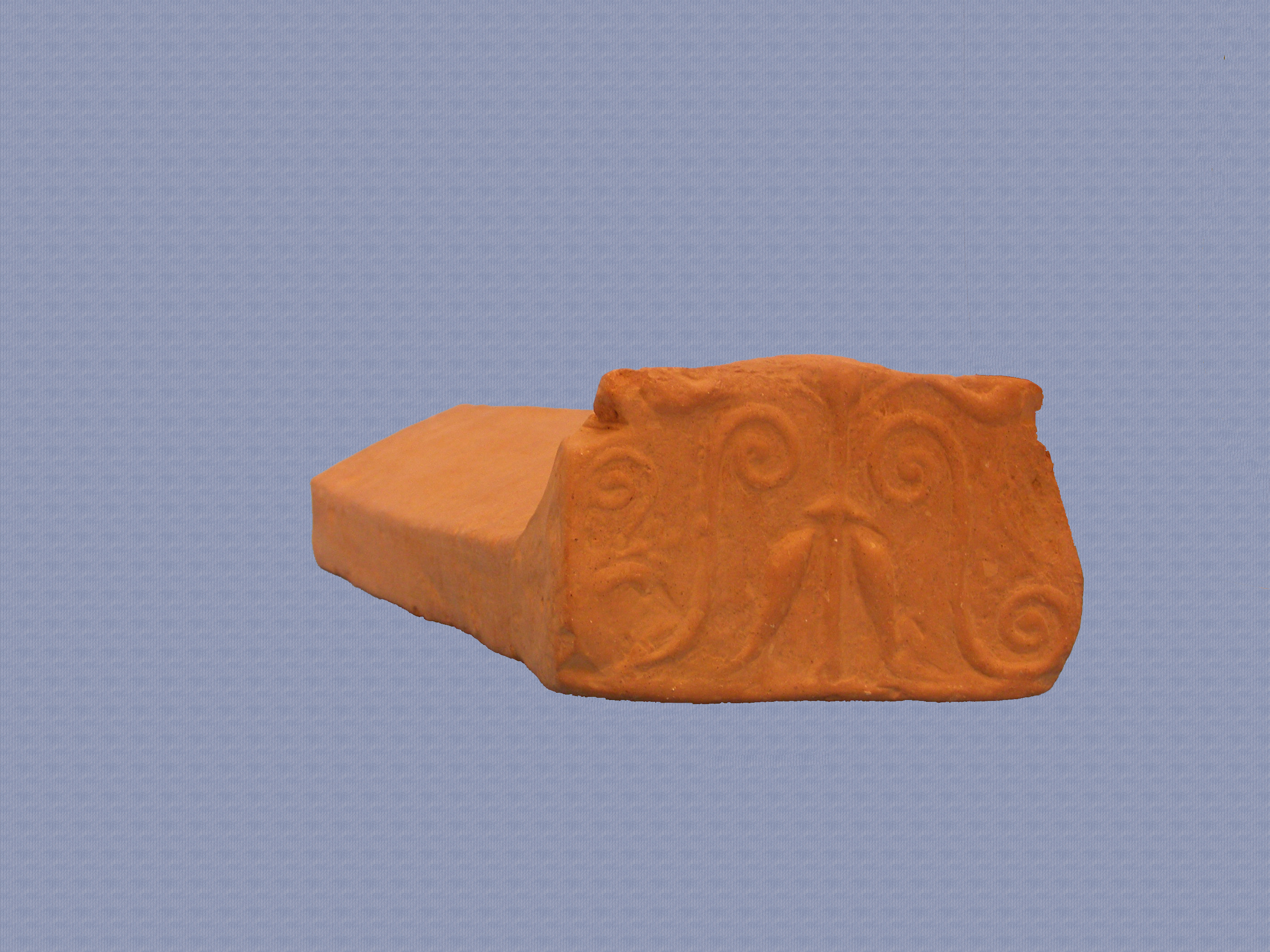 Κέραμος ηγεμόνας καλυπτήρας κορινθιακού τύπου με τμήμα του μετώπου, το οποίο διατηρείται μόνο στο κατώτερο τμήμα του. Το μέτωπο διακοσμείται με φυτικά μοτίβα και συγκεκριμένα από ένα ευθύγραμμο κεντρικό κάθετο μίσχο που απολήγει σε σφαιρικό πυρήνα, δύο σιγμοειδείς σπείρες δεξιά και αριτερά από τον μίσχο και σχηματοποιημένα άνθη λωτού στη βάση του μίσχου.