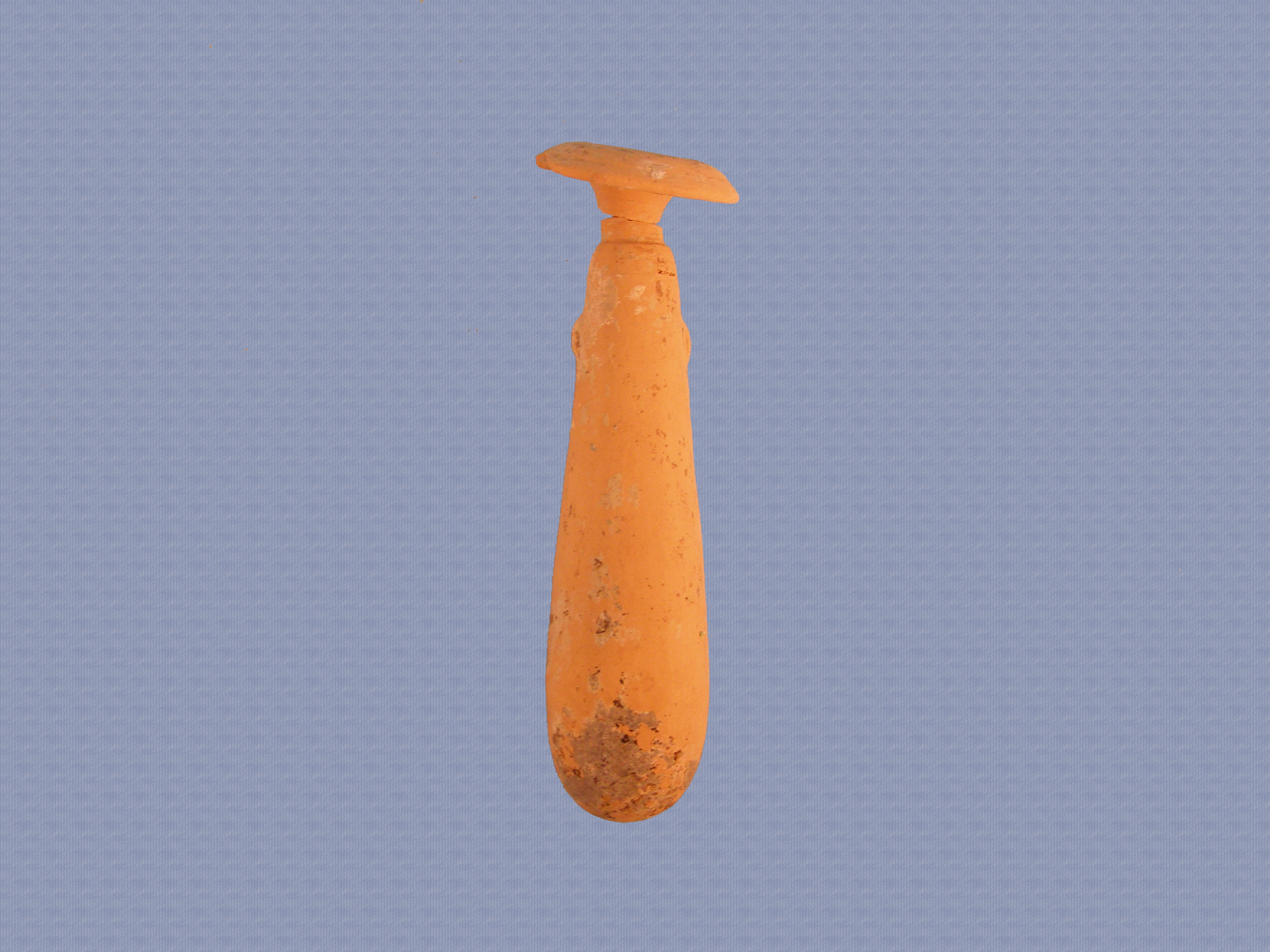 Ακέραιο άβαφο αλάβαστρο αποκεκρουμένο στο χείλος. Έχει σώμα επίμηκες στενεύει προς τα πάνω, λαιμό βραχύ και πλατύ μανιταρόσχημο χείλος. Στο άνω μέρος του σώματος διακρίνονται δύο ωτία.